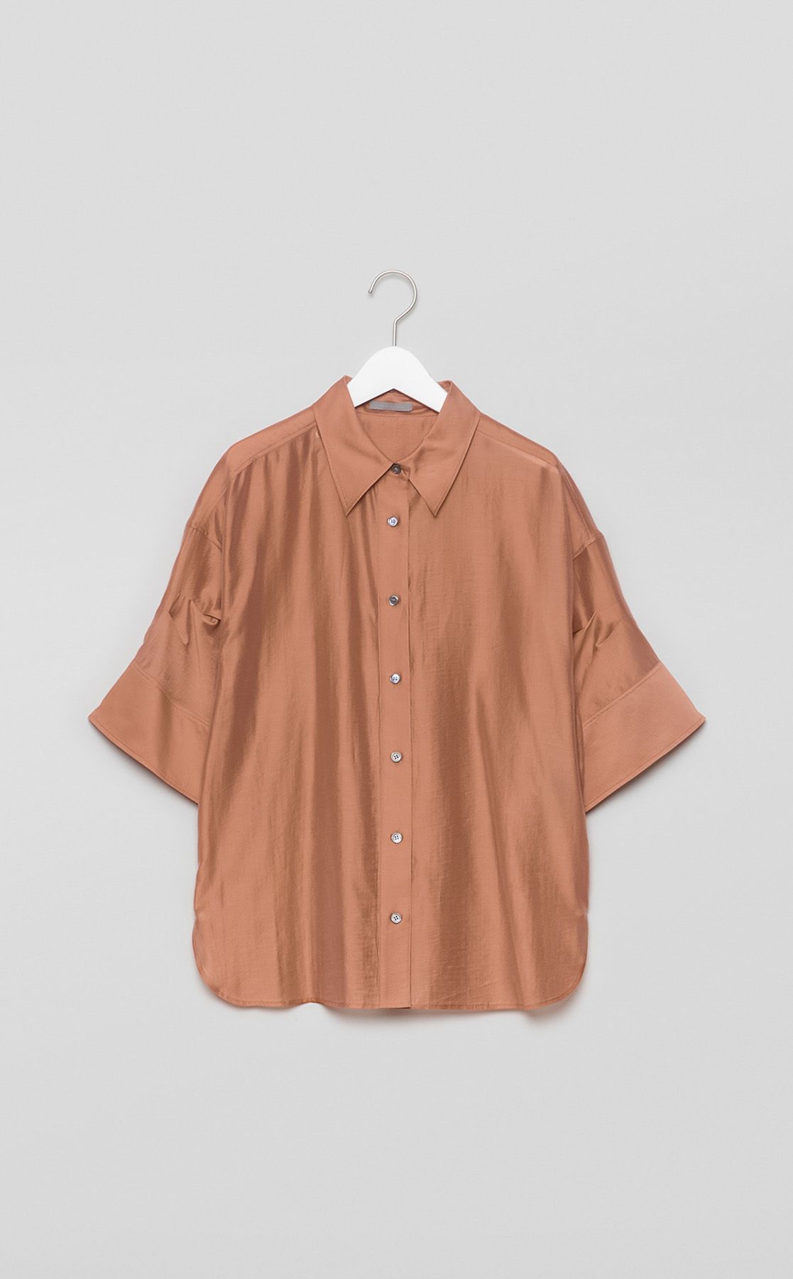 オレンジとあったが、ブラウン寄り。ブランドではコッパーと表記しているようだ。思ったよりシワになりやすく、またシワも目立つので、着たらアイロン必須。パターンが複雑かつ低温で、猛暑の中、少し面倒だった。形はとてもきれい。