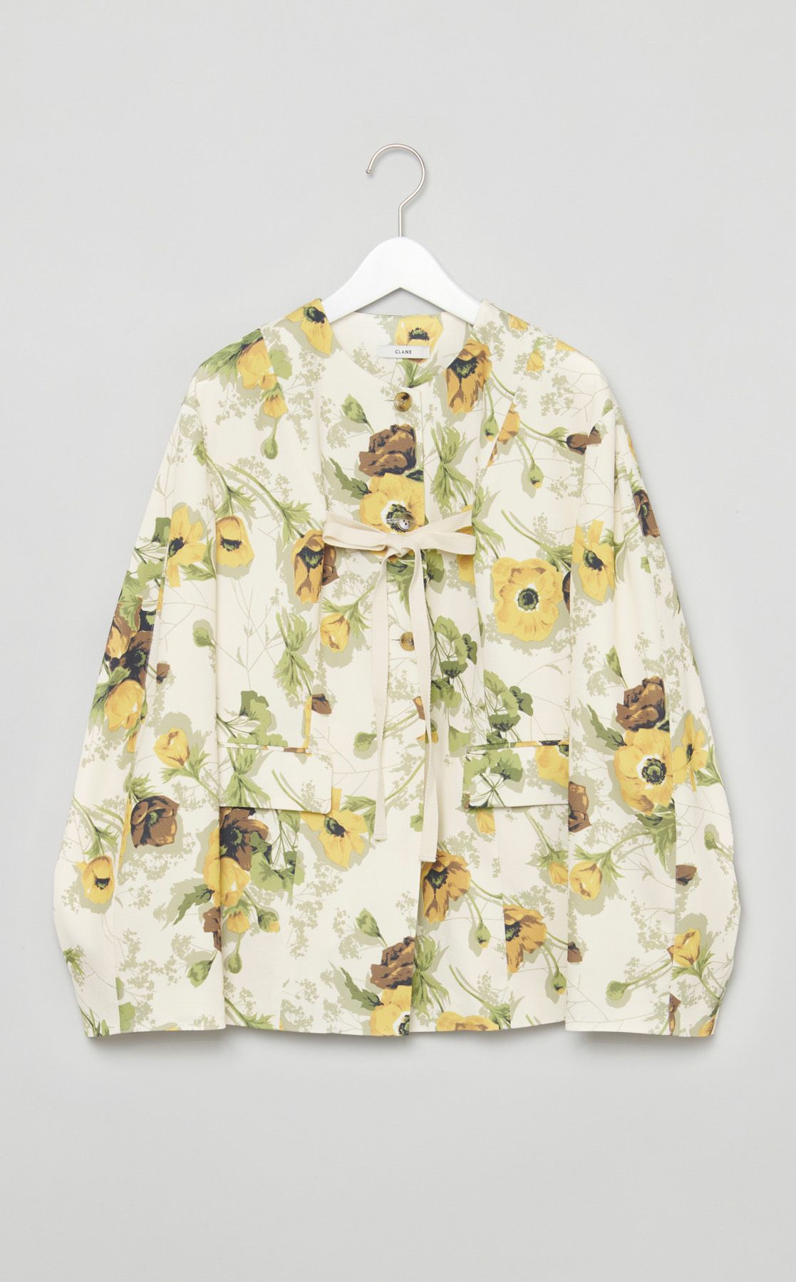 薄いクリーム色の地にカーキ、ブラウン、イエローがメインに入っています。落ち着いたトーンなので、きちんとしたシーンでも浮かずに素敵でした。前を開けてジャケット風に着たり、閉めてベルトをして着ました。素材はとても柔らかく表面に細かい凹凸があるジョーゼットで、ほんのり光沢があり、高級感がありました。おしゃれを楽しめる1着でした。