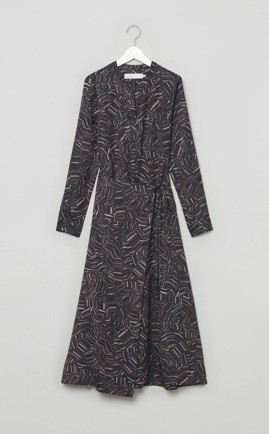 アイテム説明にメインカラーがネイビーとありますが、地の色は黒かと。少し光沢のある生地で、くすんだ色味の柄が入ってます。前ボタンがウエスト迄なのでどう着るのかと困ったら、左脇下にファスナーがありました。ドレッシーで素敵ですが、私には胸や胴回りが少しきつく、なのに背中のタック下の布はぽこんと余ってしまいました。サイズ表からは分からなかったです。