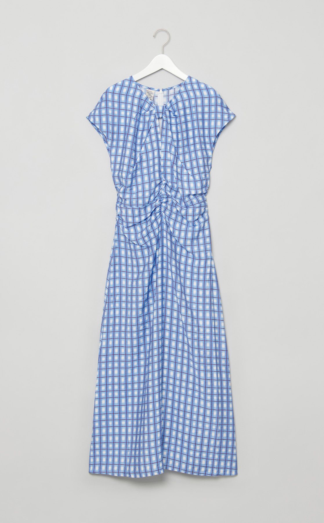 甘すぎなくてかわいい夏のギンガムチェックで、気に入りました。薄手で涼しいのですが、お腹のぽっこりを拾うので、気になる人は要注意です。前見ごろにスリットが入っているので下着が見えてしまうかも。