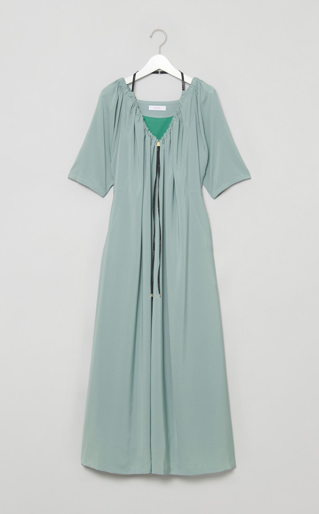 胸元のシャーリングが切り替えられるし、シワになりにくいので着やすい。ポケットがついてるのもよかった。Aライン風に見えるけど、パターンが綺麗なので骨格ストレートでも着太りしない。