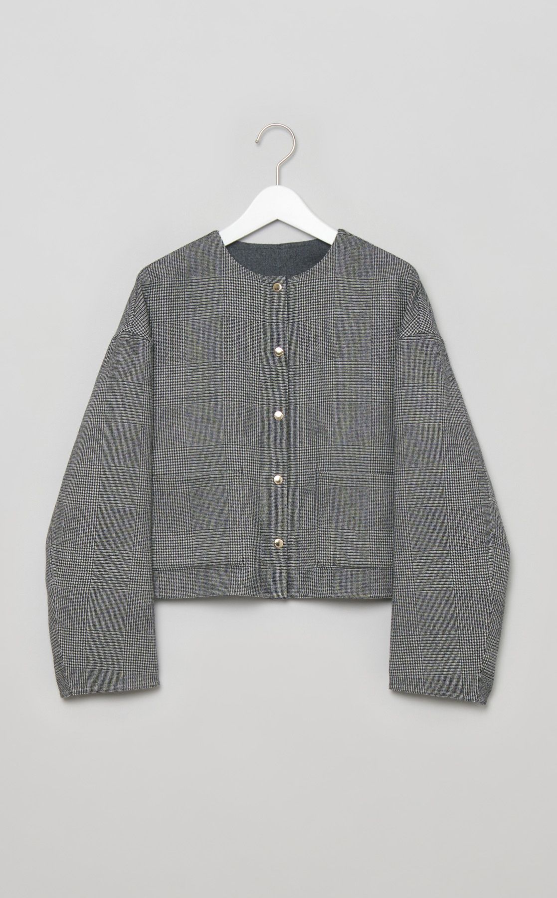 片面がチェックで、もう片面は無地なので、1着で2度おいしい感じです。パンツにもスカートにも合わせやすいと思います。