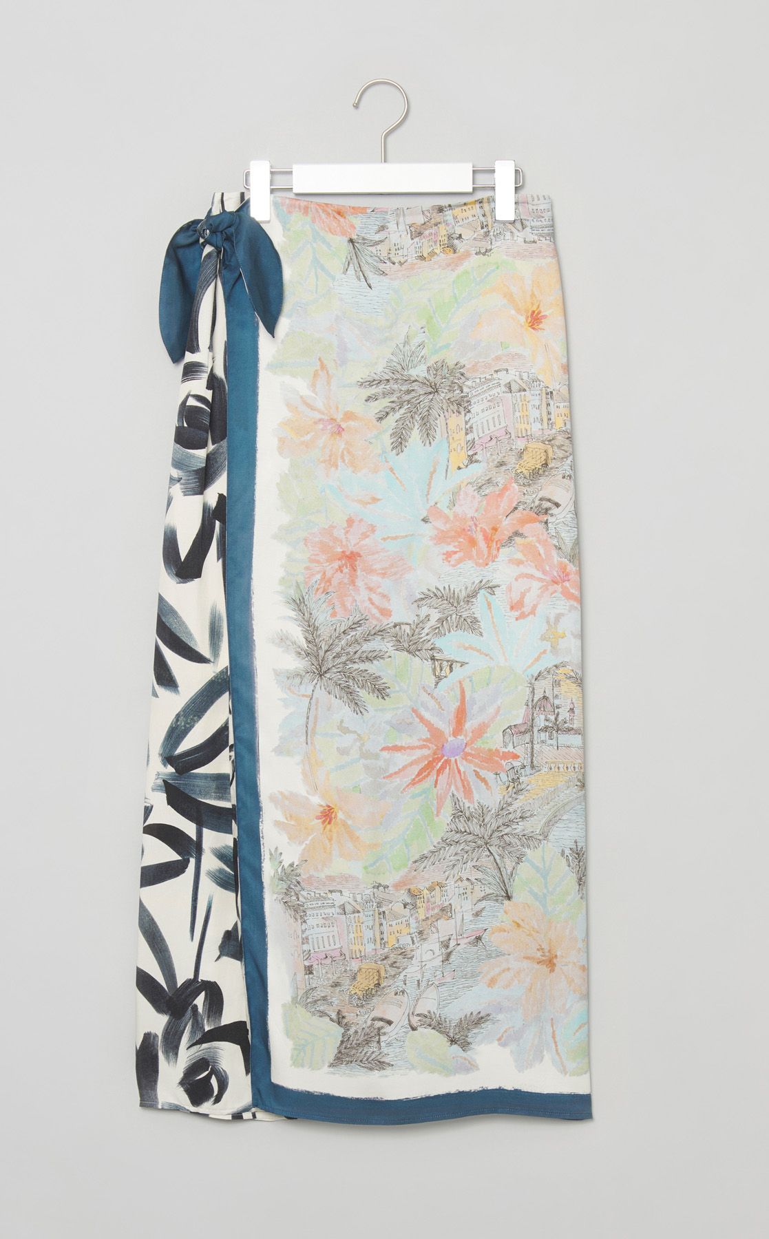 ウェストの布の切り替えで華やかな柄が2パターン楽しめてます。ウェストがゆるやかなゴムなので着ていて楽です。綺麗な柄なのでTOPSもTシャツでもハリのあるきちんと感のある方が合うように思います。