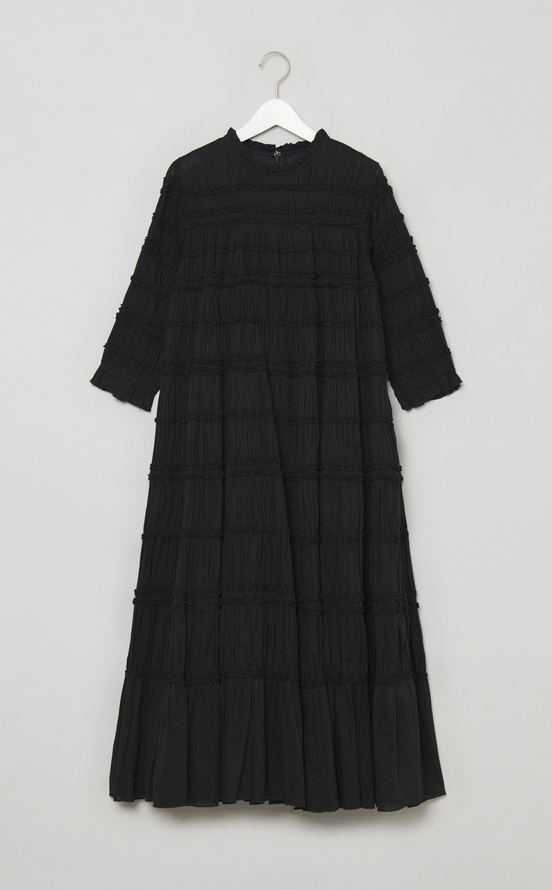 可愛さがあるのに黒色が甘くなりすぎず、丈もロングで落ち着いた印象を与えます。