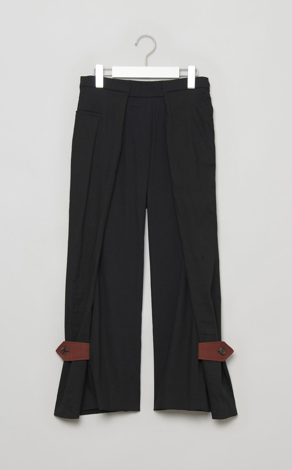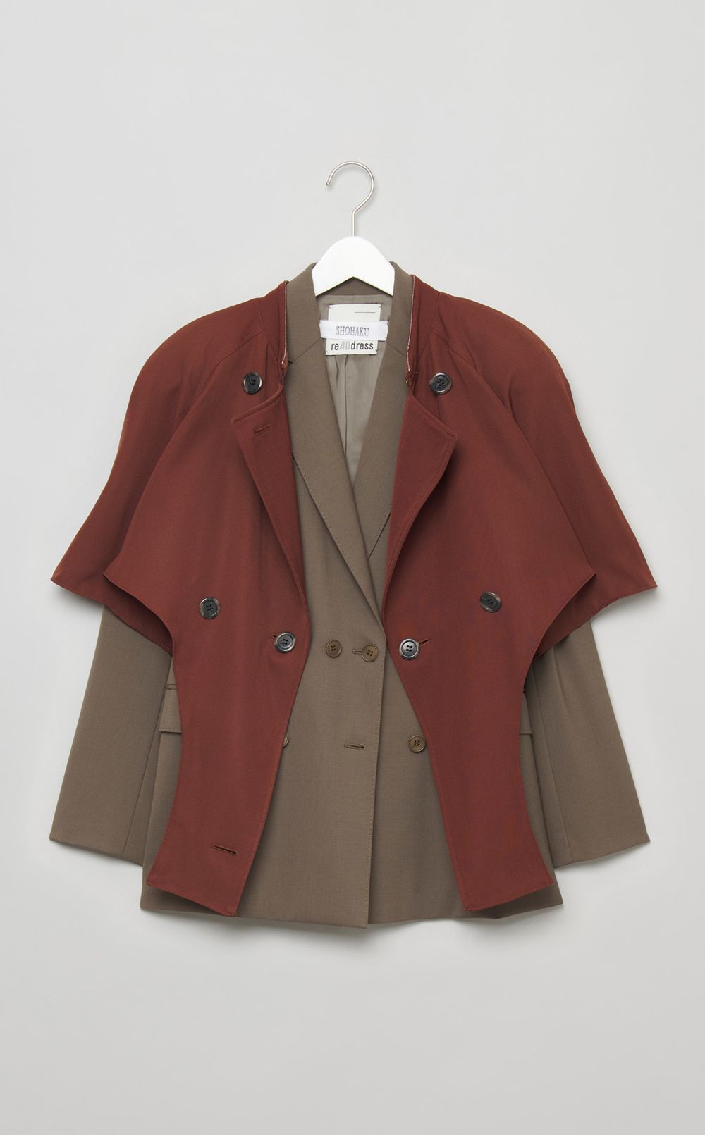 また、制作する上で日本人に宿る「侘び寂びの心」に焦点を当て、無彩色な素材をメインで選定し静けさを表現し、赤茶色のウール地を各所に使用して、時の経過による美を「錆」と捉えてデザインに落とし込んだ。
