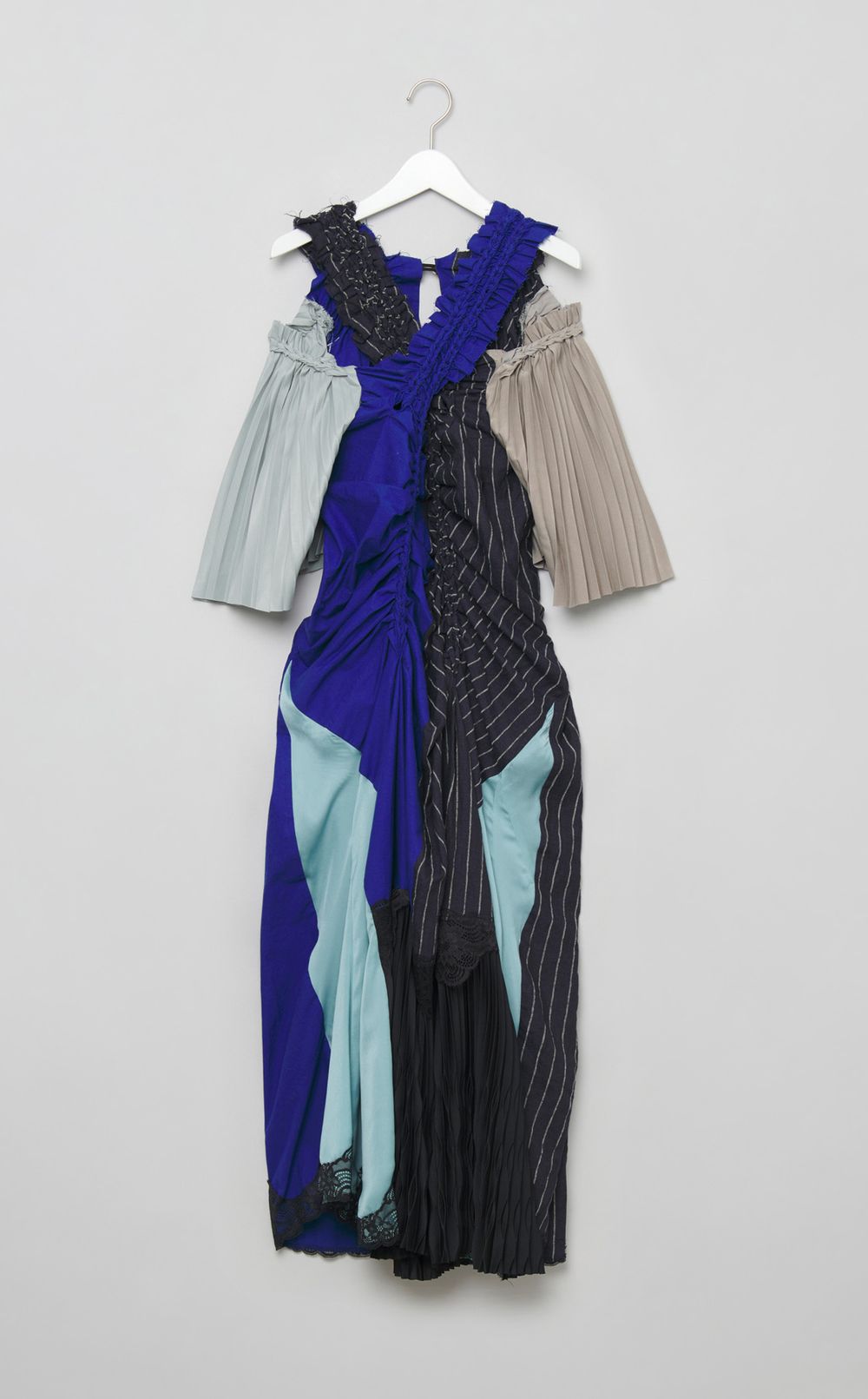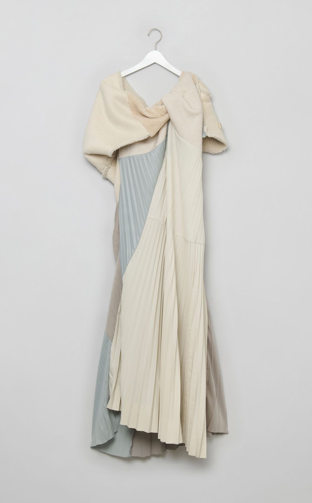 着用が終わり、私たちの手で洋服に第2の人生を歩んでもらおうと思った時に、また同じ人生ではなく別の人生も楽しいのではと思いました。メンズのカーゴパンツはレディスのフレアスカートとして、ムートンのコートはドレープドレスに、ニットのセーターたちは一度糸に戻し、糸を組み合わせ編み直しました。カジュアルなストライプは編み込みのディテールを施しギャザーをよせてフェミニンなワンピースに生まれ変わりました。第2の人生も着用するたびにワクワクされるお洋服になったのではないかと思います。