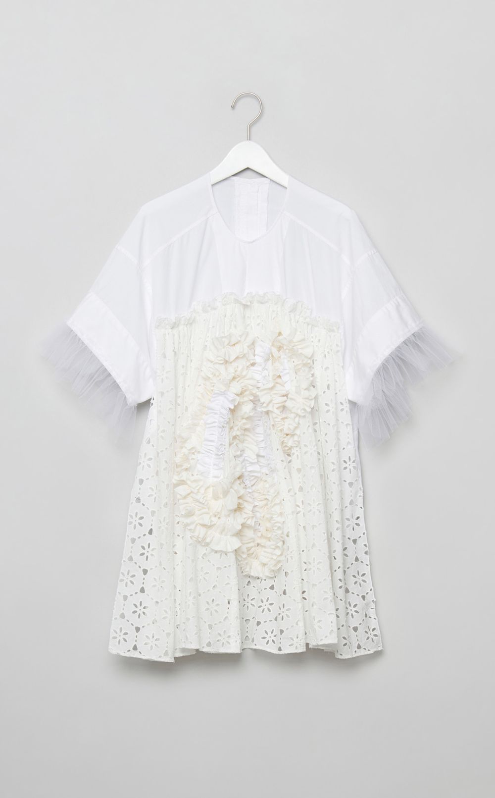 一つ一つの洋服、生地を大切に。シミや傷の多いものは、使える場所を裁断し、刺繍のようにギャザーを寄せ、一度役目を終えた洋服にも一筋の光が見えるような洋服へ。フリルやキャザーなどにデザインを落とし込むことによって体の立体感と同じく洋服にも立体感を取り入れた。