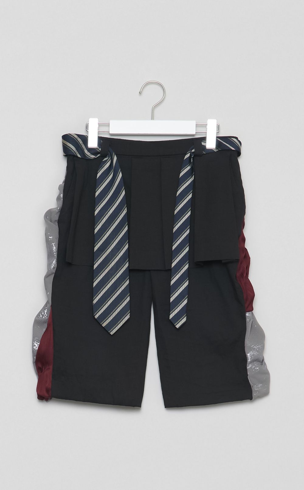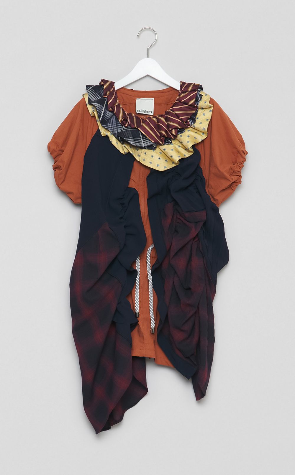 古着とネクタイを再構築し、ギャザーを使って感情の波を表現しました。不要になった衣服に新しい意味を与え、過去の素材が持つ温度や記憶を活かしてデザインし、揺れながらも動く、その一瞬に意味を込めました。