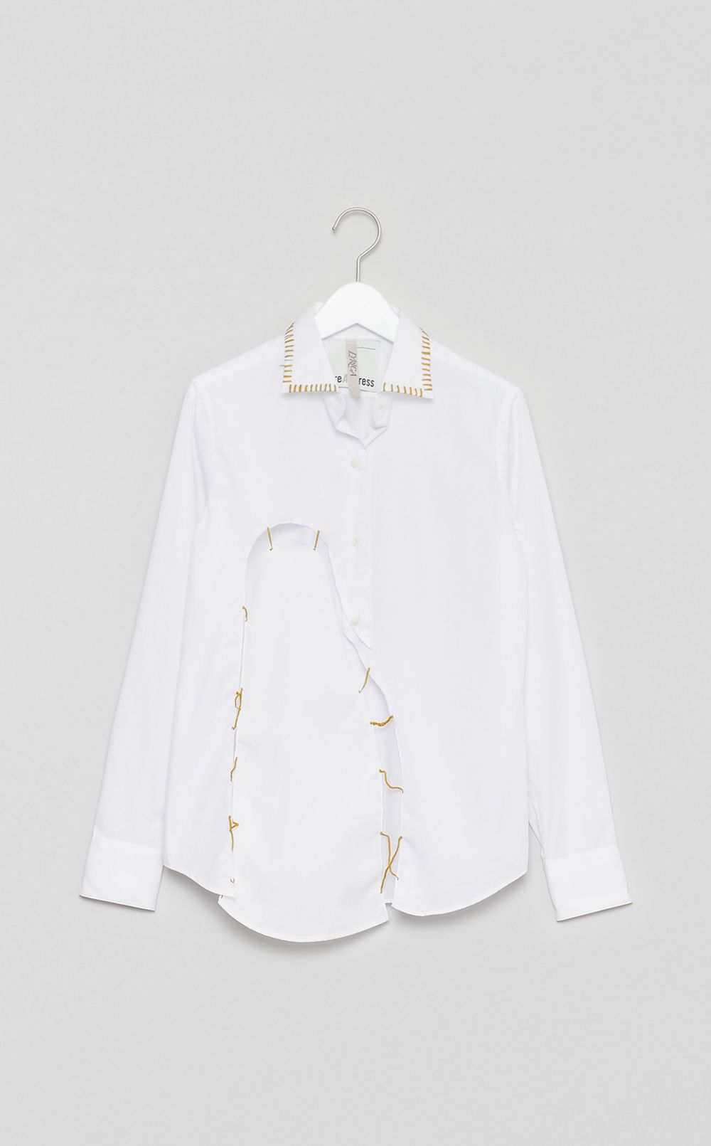 かつて誰かが着ていた服を不規則な断片へと解体し、その欠片を金の糸で繋ぎ直して再構築しました。異なる形の断片は、誰も同じではない個人の経験を象徴します。そして金の糸は、金継ぎのように傷を隠さず肯定するための線です。誰かの思いが詰まった服の歴史を受け継ぎ、断片から新たな形を立ち上げる事で、同じである事が正解とされる社会に抗い、違いから生まれる個を肯定するデザインにしました。
