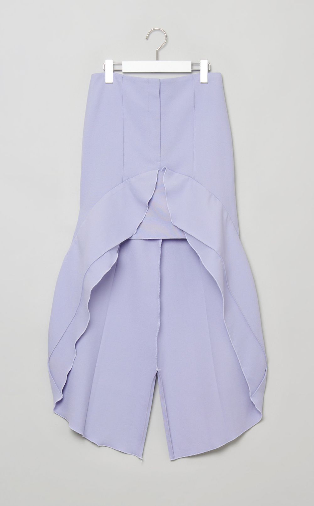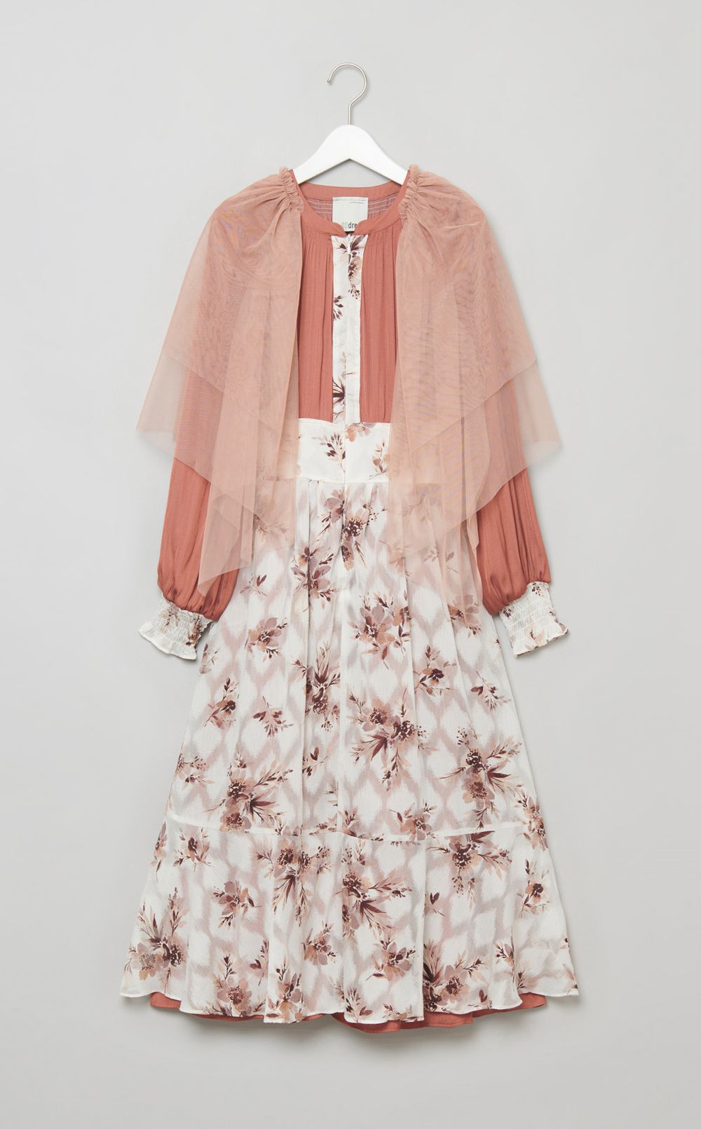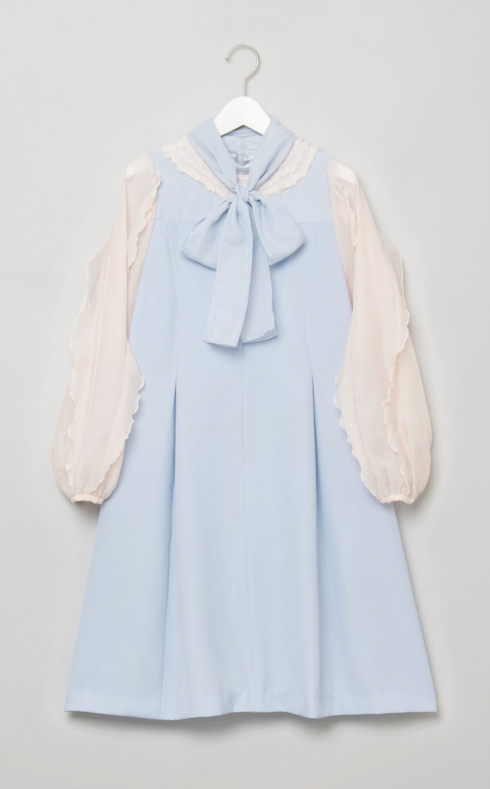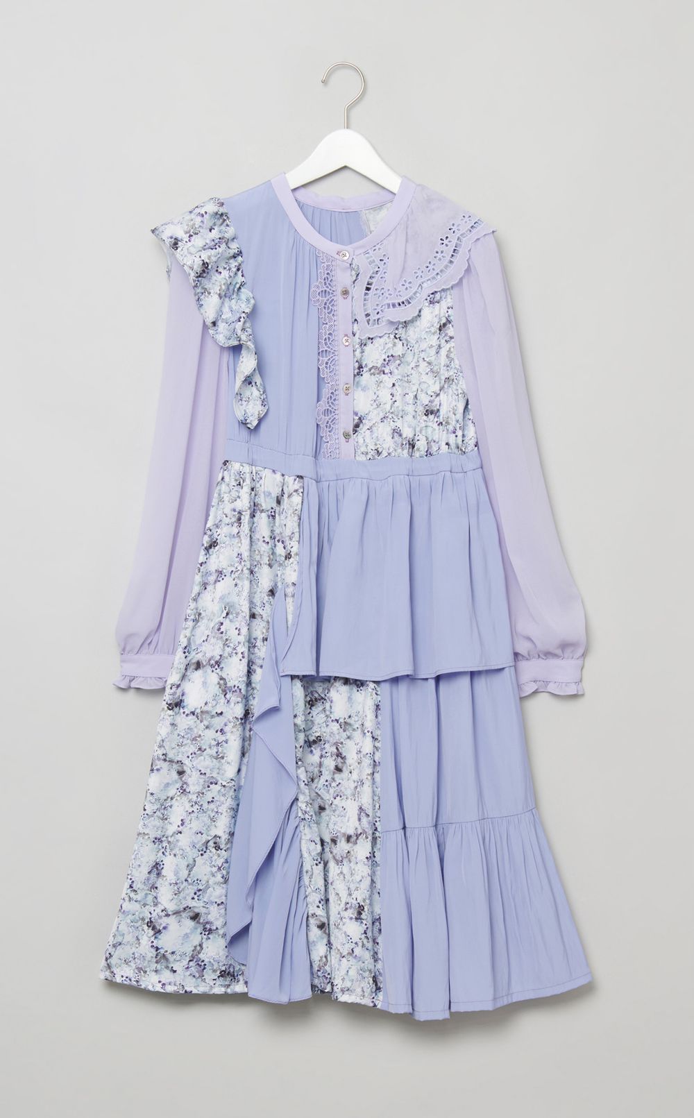 一面に広がるネモフィラ畑の穏やかさと開放感を表現しました。提供していただいた服の思いも繋ぎとめて、一歩踏み出そうとしている人や変わりたい人を応援する服にリメイクしました。全体的に軽やかな色味は着る人を明るく前向きにさせます。一般的な服にはない装飾性には特別感があり、この時やこの場所のために着たいと思ってもらえるような服にしました。