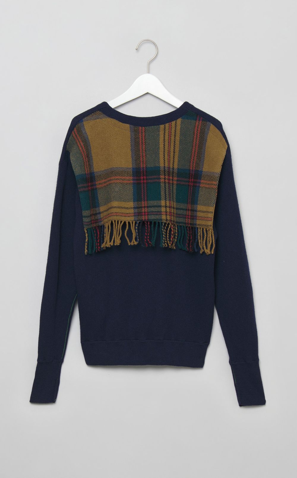 私は普段カフェでアルバイトをしています。そこで捨てる予定だった穴が空いたブランケットがあったので、今回いただいた古着の資材と掛け合わせてデザインしました。