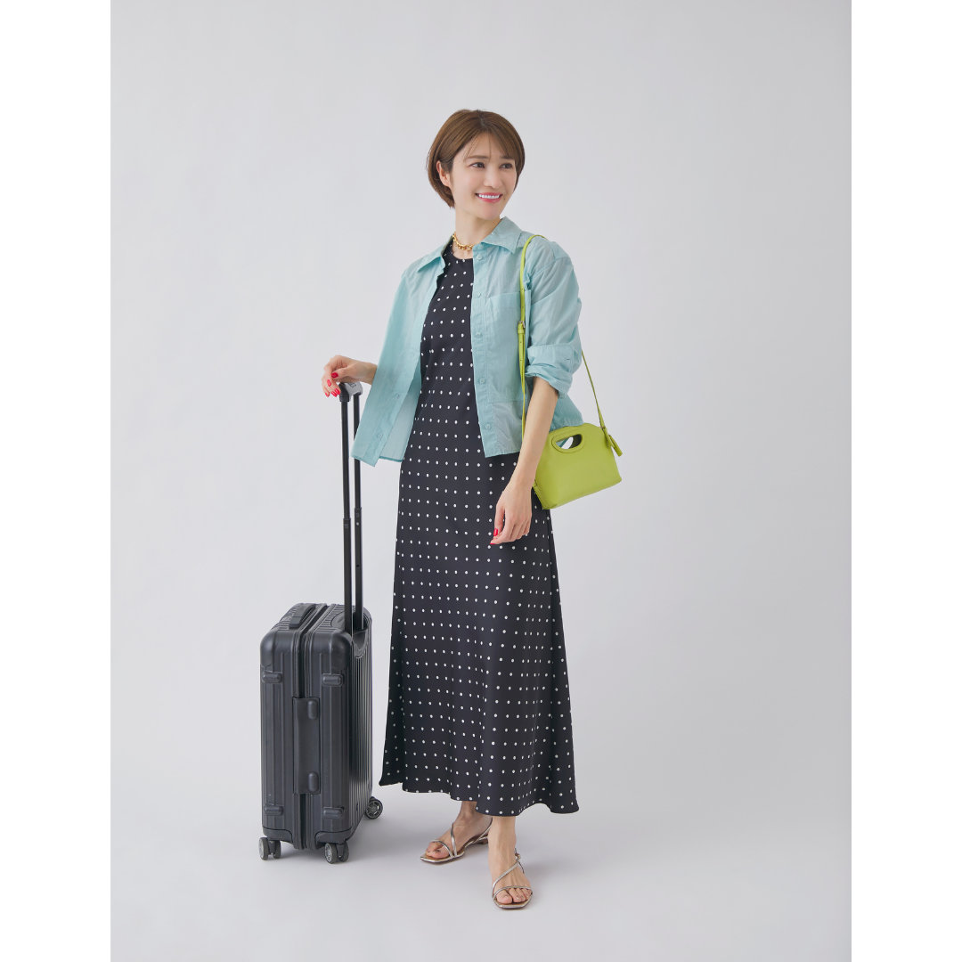 アイテムとしては、上下ともになるべくベーシックなアイテムを選ぶのが◎。ただし、せっかくの旅行で気分も上げたい――そんなときは、複数着のうち1〜2着は柄物などにしたり、ワンピースなどの1枚でサマになるアイテムをいれたりするのがポイントです。