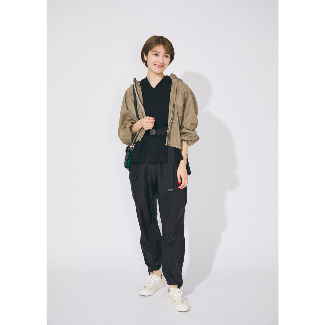 ボトムスに選んだのは、軽快なジョガーパンツ。シルク素材なので、スポーティなアイテムでも上品できれいめな印象をプラスしてくれます。小物もレザー素材のバッグを選ぶことで、全体のコーデがカジュアルになりすぎず、洗練された印象に。動きやすさと品の良さを両立した、大人の春旅スタイルです。