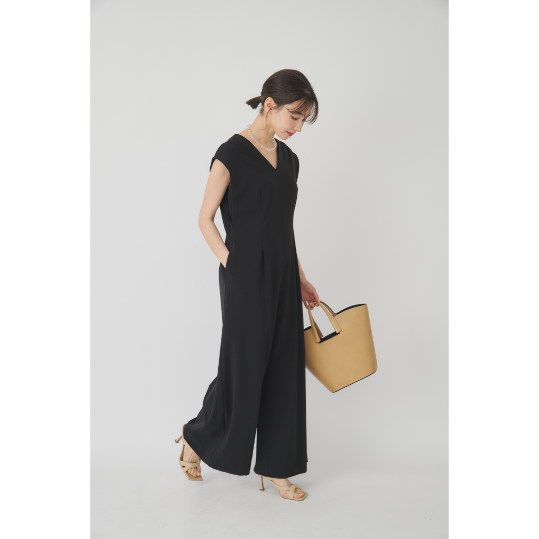 さらりと1枚で着られるトロワズィエムチャコ(troisiemechaco)のブラックのオールインワンは、肌離れのいい落ち感素材で、暑い日でも涼しく快適。深めのVネックがデコルテをすっきりと見せつつ、肩先を自然に覆うデザインなので、品よく映える点はうれしいポイントです。ワイドシルエットで脚のラインも拾わず、長時間の移動もストレスフリー。足元とバッグにはベージュを合わせて、コーデに抜け感を演出しました。