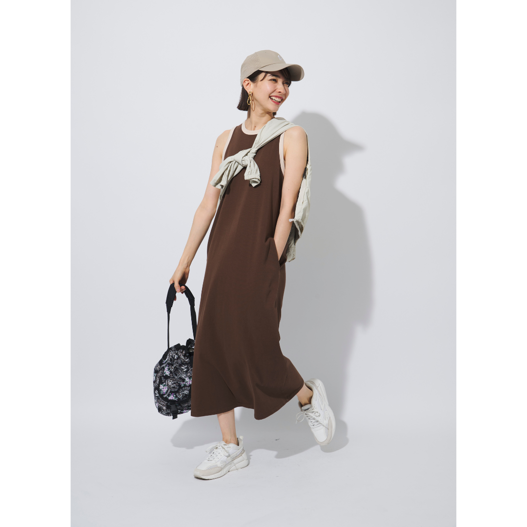 夏の旅行におすすめな軽快でカジュアルなワンピーススタイル。ノースリーブのカットソーワンピースは、動きやすくて風通しも抜群。ラフすぎず大人っぽく着られるブラウンカラーを選ぶことで、カジュアルながらも落ち着いた印象に仕上がっています。