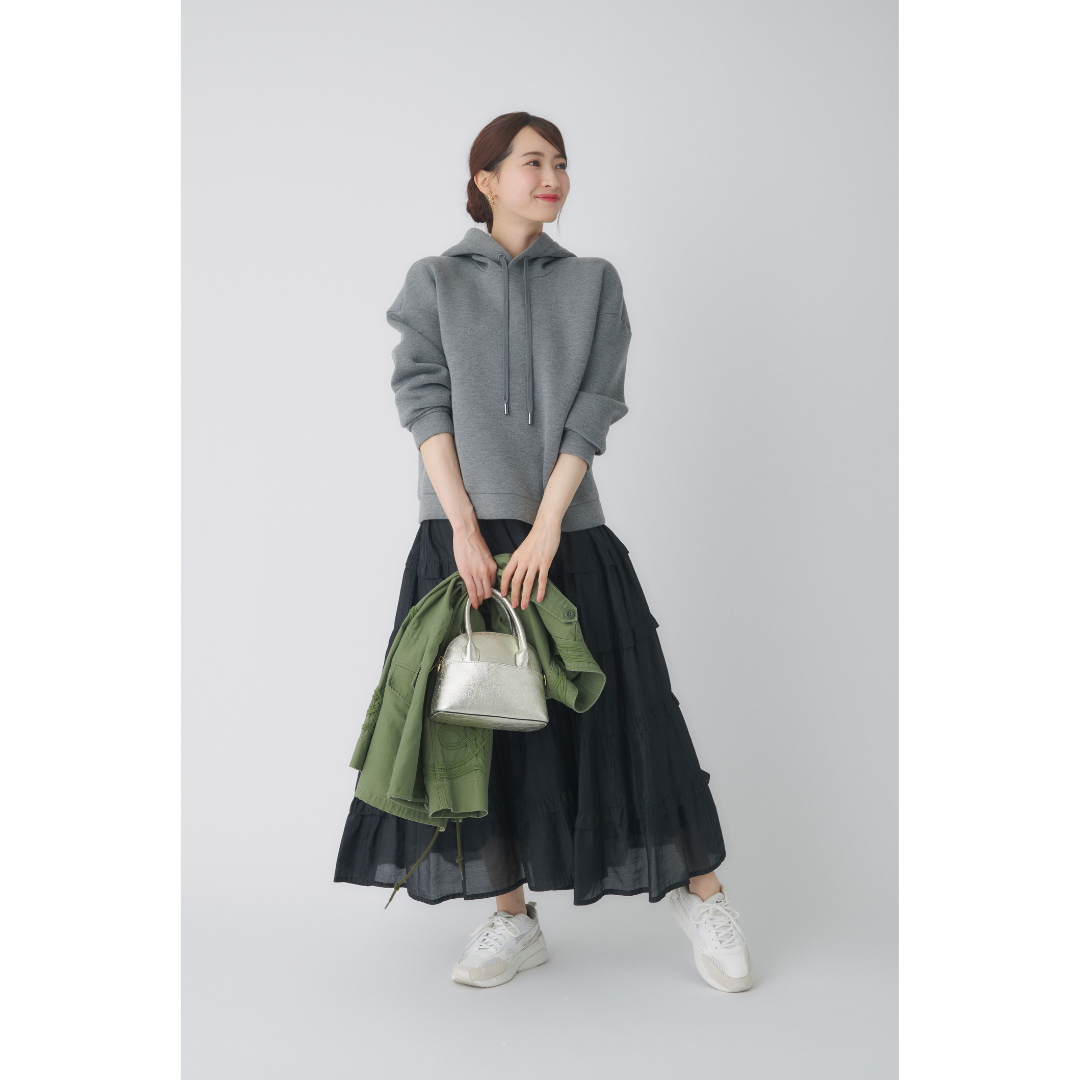 ウィークエンド マックスマーラ(Weekend Max Mara)のライトグレーのパーカーは、ゆったりとした身幅で動きやすく、旅先でも快適に過ごせます。ボトムスにはふんわりと広がるティアードスカートを合わせて、カジュアルさにフェミニンな印象をプラス。手持ちのカーキのブルゾンとシルバーのミニバッグがさりげないアクセントに。足元はスニーカーで歩きやすさをキープすれば、観光にぴったりな秋旅コーデの完成です。