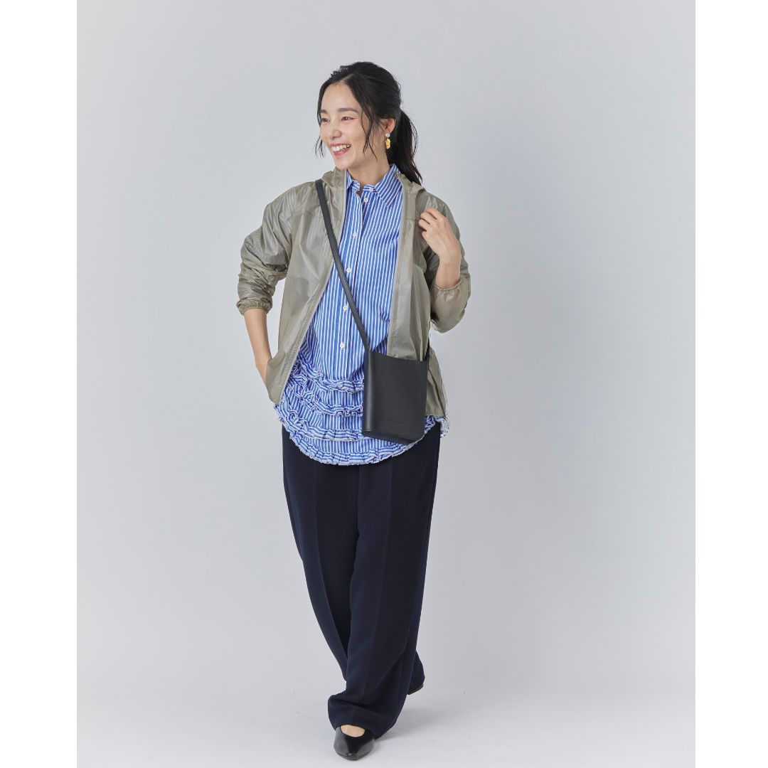旅先によっては気温差が激しい秋旅行は、気温調整しやすい重ね着スタイルが強い味方。ブルーのストライプシャツは、爽やかさもありつつ、シャツの裾からのぞくフリルディテールが着こなしに奥行きを与えてくれます。羽織ったシャカシャカ素材のアウターは、朝晩の冷え込みに対応できるだけでなく、コンパクトに収納できる利便性も◎。