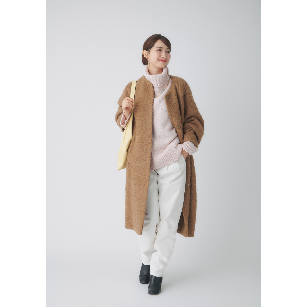 エスロー(ESLOW)のキャメルコートは、上質なウール素材を使用しており、暖かさはばっちり。軽さもあるので、長時間着用していても着疲れしにくいのもうれしいポイントです。中には、淡いピンクのタートルネックニットを合わせて、女性らしい柔らかさとほんのりとした甘さをプラス。