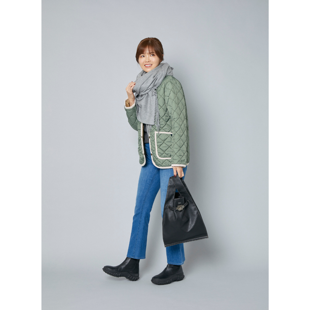 ボトムスは、カーキのアウターと相性のいいブルーデニムを選んで、動きやすさとカジュアル感を両立。シューズやバッグは黒で引き締め、首元にボリューム感のあるストールを巻けば、防寒性と洒落感を兼ね備えた冬旅スタイルに。