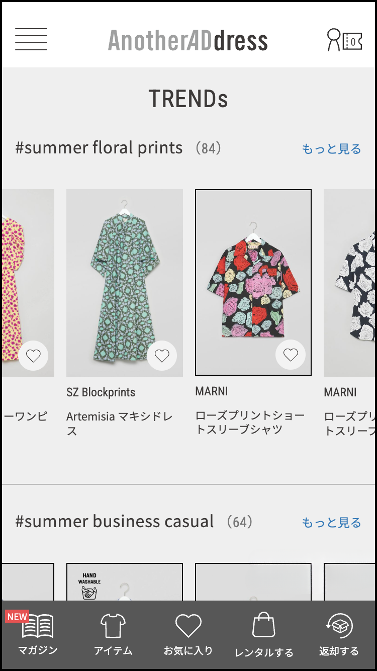 アナザーアドレスのバイヤーが、いま特におすすめしたいアイテムをテーマ別に紹介しているのが「TRENDs」。たとえば、夏らしい花柄アイテムを集めた「#summer floral prints」や、通勤コーデに役立つ「#summer business casual」など、季節や気分に合ったセレクトが充実しています。気になるテーマをクリックするだけで、旬のアイテムをまとめてチェックできるので、ぜひレンタルの参考にしてみてください。