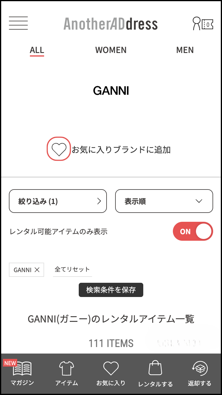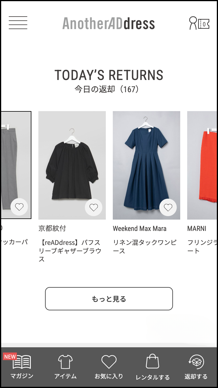 その日に返却されたばかりのアイテムをチェックできる「TODAY’S RETURNS」は、誰かが実際にレンタルした“人気の証”が集まる注目コーナー。人気ブランドや話題のアイテムがタイミングよく見つかることもあるので、気軽にのぞいてみるのがおすすめです。思いがけない出会いがあるかもしれません。