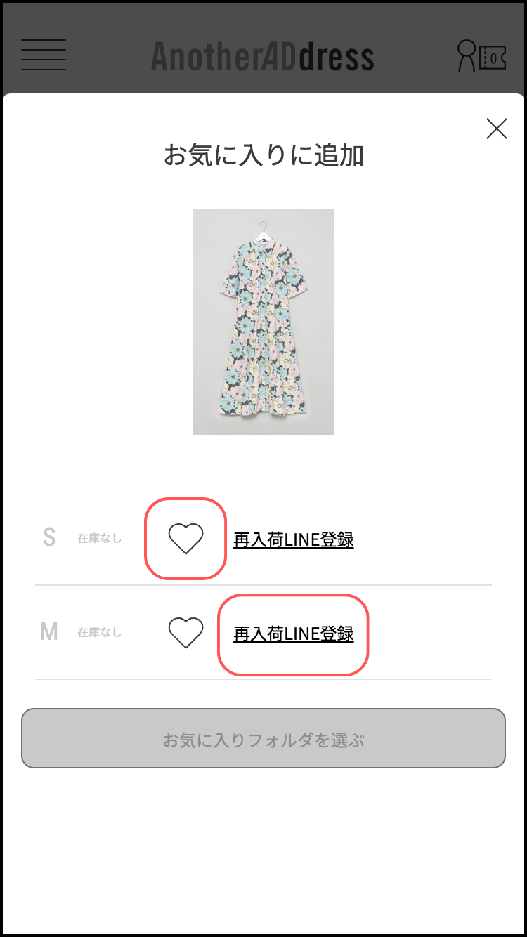 サイズごとにハートが表示されるので、自分に合ったサイズの隣を選べばOKです。在庫がないアイテムは「再入荷LINE登録」をタップすれば、再入荷時にLINEで通知が届く便利な機能も。