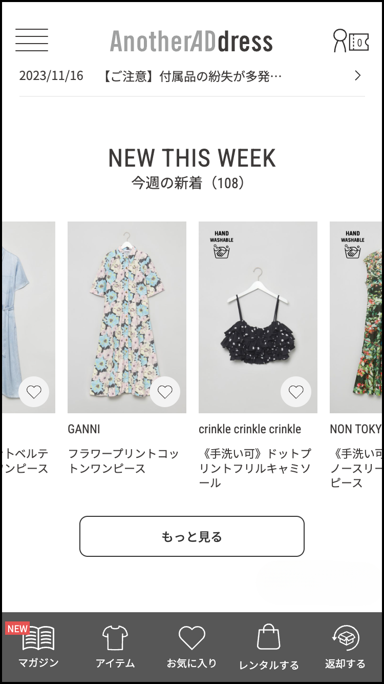 「何かレンタルしたいけれど、まだ具体的なイメージがない……」そんな時は、ログイン後トップページから確認できる「NEW THIS WEEK」「TRENDS」「TODAY’S RETURNS」の3つのコンテンツをチェック!新作やトレンド、リアルな利用アイテムまで、今の気分にぴったりな1着がきっと見つかります。