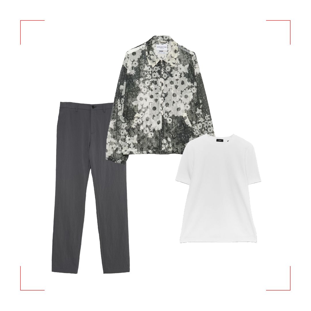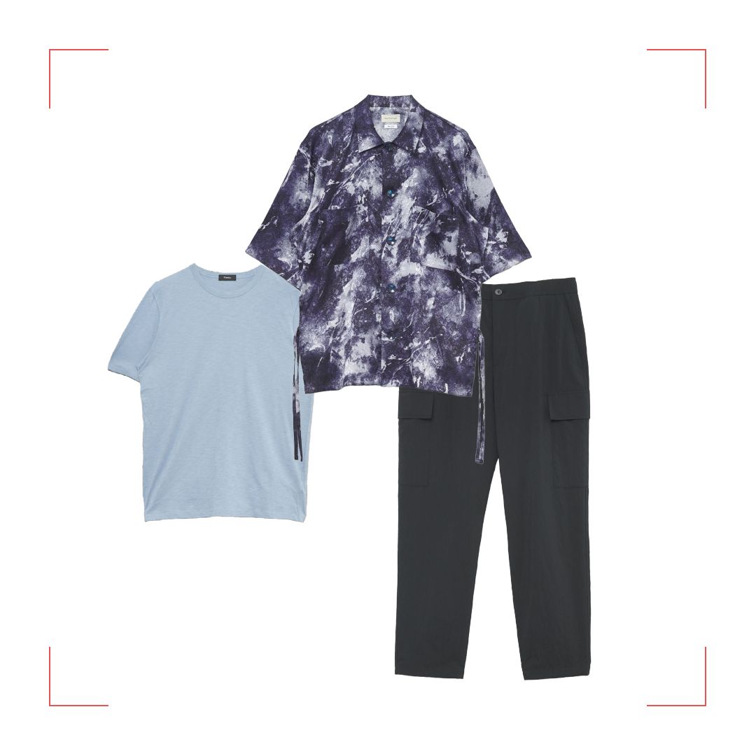 色はベーシックにまとめつつ、いつもより少し肩の力を抜いた素材やデザインがぴったり。シンプルなTシャツの上に、デザイン性のあるゆったりとしたサテン素材のシャツを重ね、軽やかさと上品さを両立。ボトムスには、かしこまりすぎず、それでいてだらしなく見えないカーゴパンツを合わせることで、ちょうど良い抜け感を演出できます。