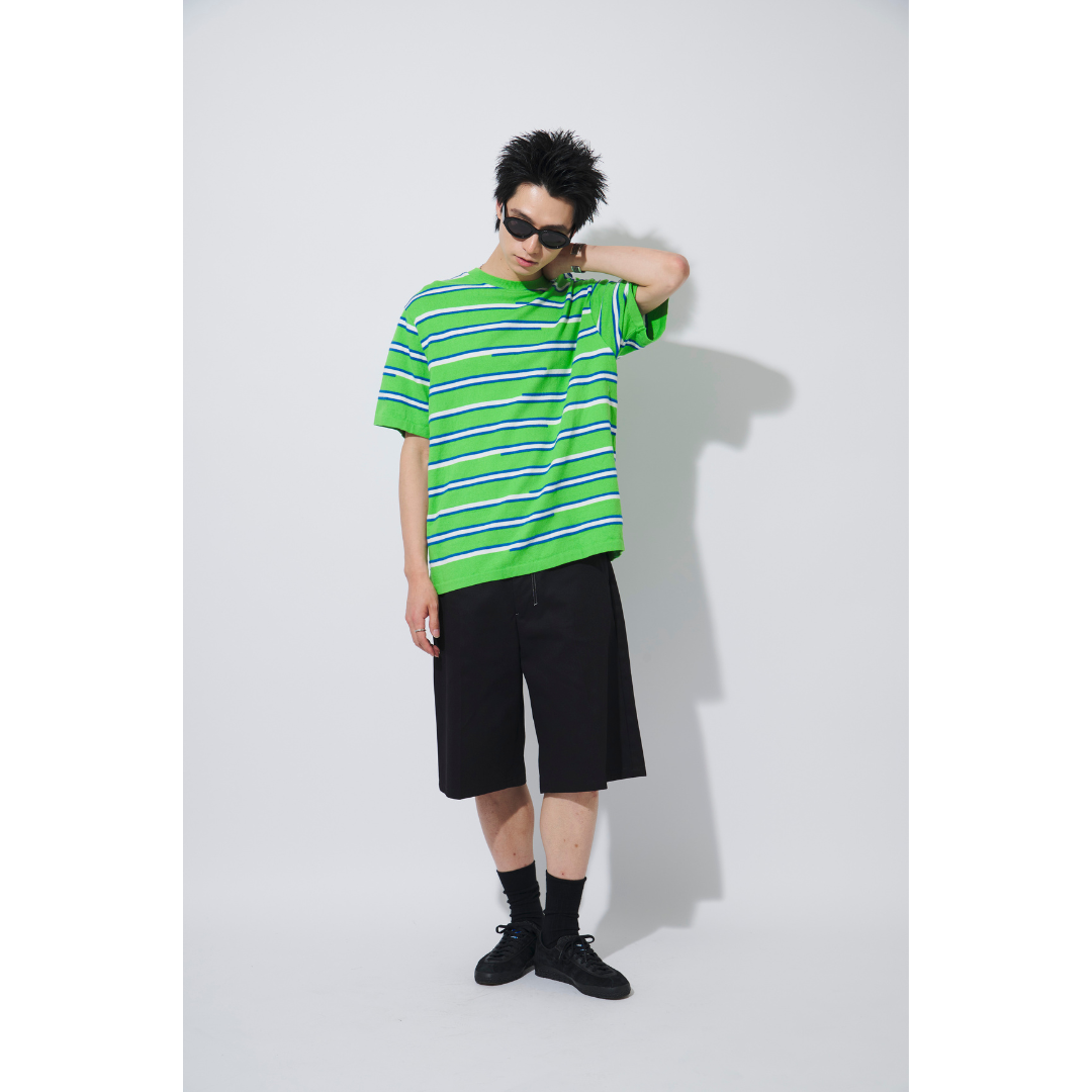 鮮やかなグリーンが映えるボーダーTシャツには、コーデを引き締めてくれる黒のショートパンツがグッド。ワーダー(WARDER)のショートパンツは、コットンポリエステルの混紡素材で、暑い夏でも快適です。ほどよくゆとりのあるサイズとひざ下丈でトレンド感も◎。サングラスやシューズも黒でまとめ、統一感のあるスタイリングに。