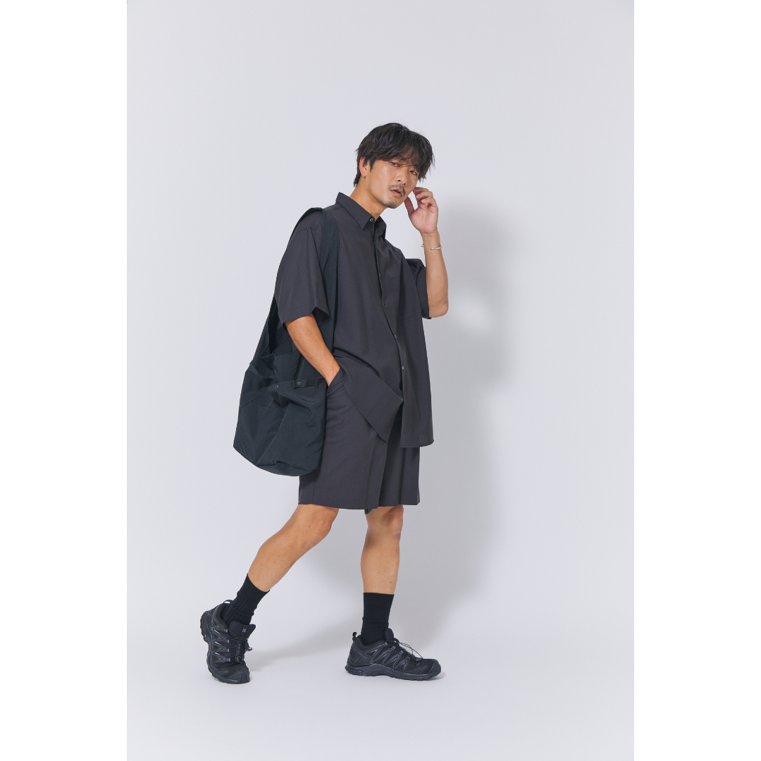 ショートパンツの取り入れ方に悩む方は、セットアップでの着用もおすすめ。マーカウエア(MARKAWARE)のセットアップは、上質なサマーウールを使用しているので、大人っぽく上品な雰囲気で着られます。サラッとした着心地で通気性もいいので、ブラックでも涼しく快適です。小物やシューズもモノトーンで統一すれば、洗練されたモード感漂うスタイリングに。