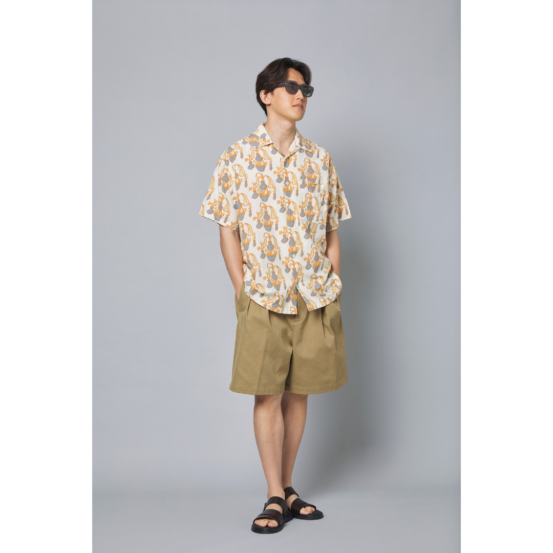 40代・50代はあえてやわらかいカラーでまとめると、渋さをやわらげ、大人の品格を引き立ててくれます。リラックス感漂う柄シャツは、トーンが抑えられているので、派手すぎず大人の男性にも◎。ボトムスもベージュのチノショーツを選んで、まとまりのある雰囲気に。小物やシューズはブラックで引き締めて、品よく仕上げました。