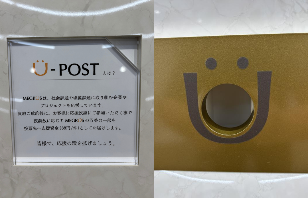 小川さん:MEGRÜSの店舗では、ご成約で得られた弊社収益の一部を、環境や社会課題に取り組まれているプロジェクトや事業そのものに対する応援資金として支援していく計画を進めています。MEGRÜSの店舗内には専用什器を設置し、支援対象となる2つのプロジェクトを掲示。買い取りが成立したお客さまには、その中から関心のあるプロジェクトを1つ選んで投票していただく仕組みです。投票数に応じて、1件につき88円を応援資金として支援いたします。