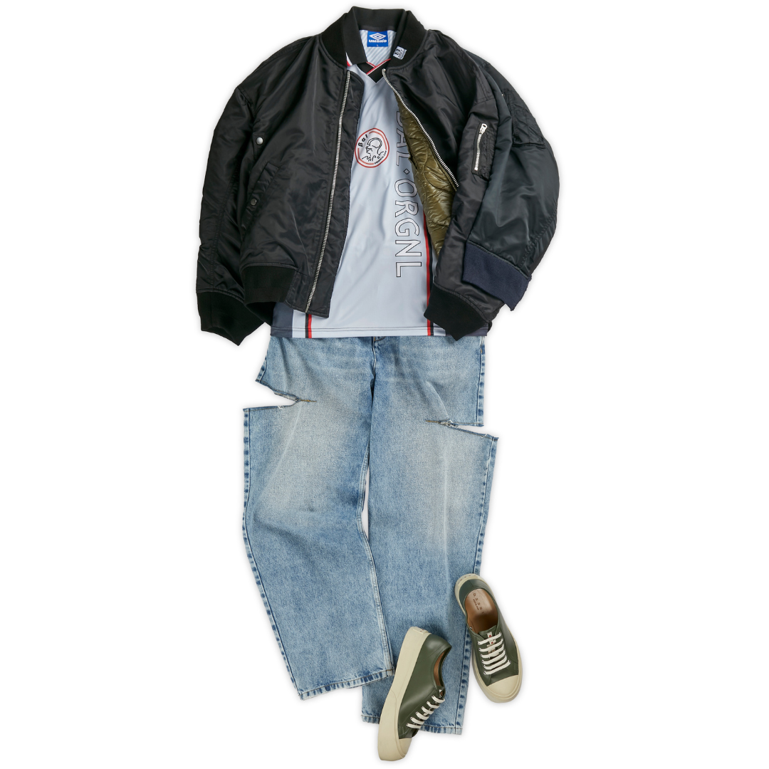 メゾン ミハラヤスヒロ(Maison MIHARA YASUHIRO)のMA-1は、もう1つのMA-1をバックにドッキングしたような個性的なデザインが魅力。デニムは、サイドに大胆な切り込みの入ったダメージ加工が施されており、着るだけで存在感を放ちます。どちらもサイズ感がゆったりめなので、しっかりとした骨感のあるナチュラル体型にも自然にマッチ。インナーにスポーティーなゲームシャツを合わせれば、遊び心をプラスしたストリートコーデが完成します。