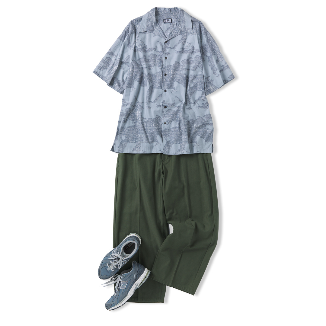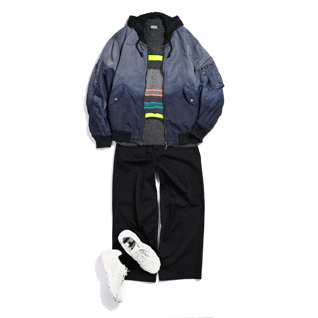 ボトムスに合わせた、ディーゼル(DIESEL)のほどよくゆとりのある黒のワイドパンツは、全体の引き締め役に。足元は白スニーカーを合わせて、明るさと抜け感を演出しました。