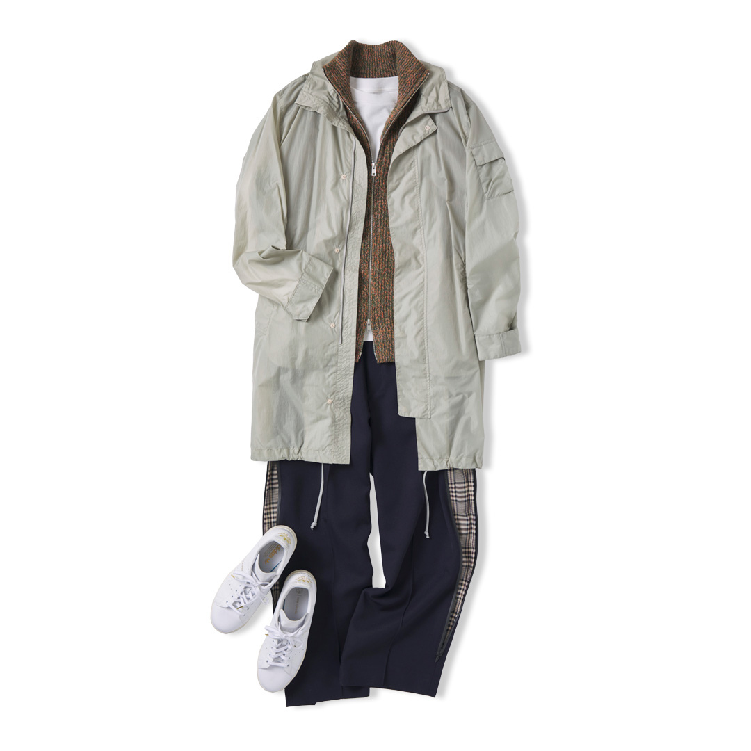ナイロン素材のコートにニットベストを重ねた、奥行きのある異素材MIXコーデ。キクスドキュメント(KICS DOCUMENT.)のコートは、薄手なのでサッと羽織りやすく、朝晩の気温差にも楽に対応できます。インナーにレイヤードしたニットベストは、上まで閉じずに少しだけ開いて、抜け感のある着こなしに。