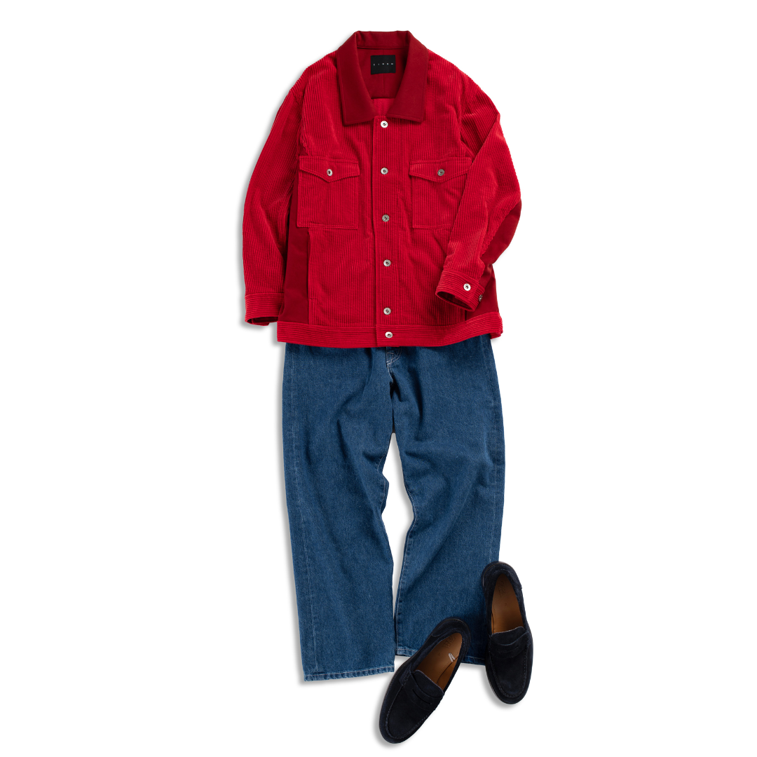 コーデュロイ素材の鮮やかな赤ジャケットが主役の秋コーデ。チノ(CINOH)のコーデュロイジャケットは、太畝の素材感と大きめポケットがほどよいボリュームを生み、ナチュラル体型に絶妙にフィットしてくれます。