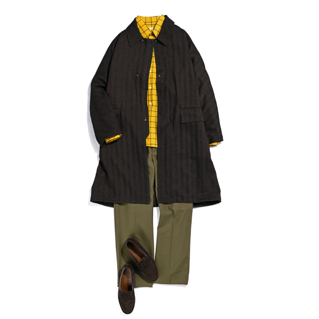 レミレリーフ(REMI RELIEF)のコートは、ブラウンベースにストライプがさりげなく入ったクラシカルな雰囲気漂う1着。身体のラインを拾わないゆとりのあるサイジングなので、骨格ナチュラルの男性にもおすすめです。インナーには、鮮やかなイエローのチェックシャツを差し込み、暗くなりがちな冬の装いに明るさをプラス。