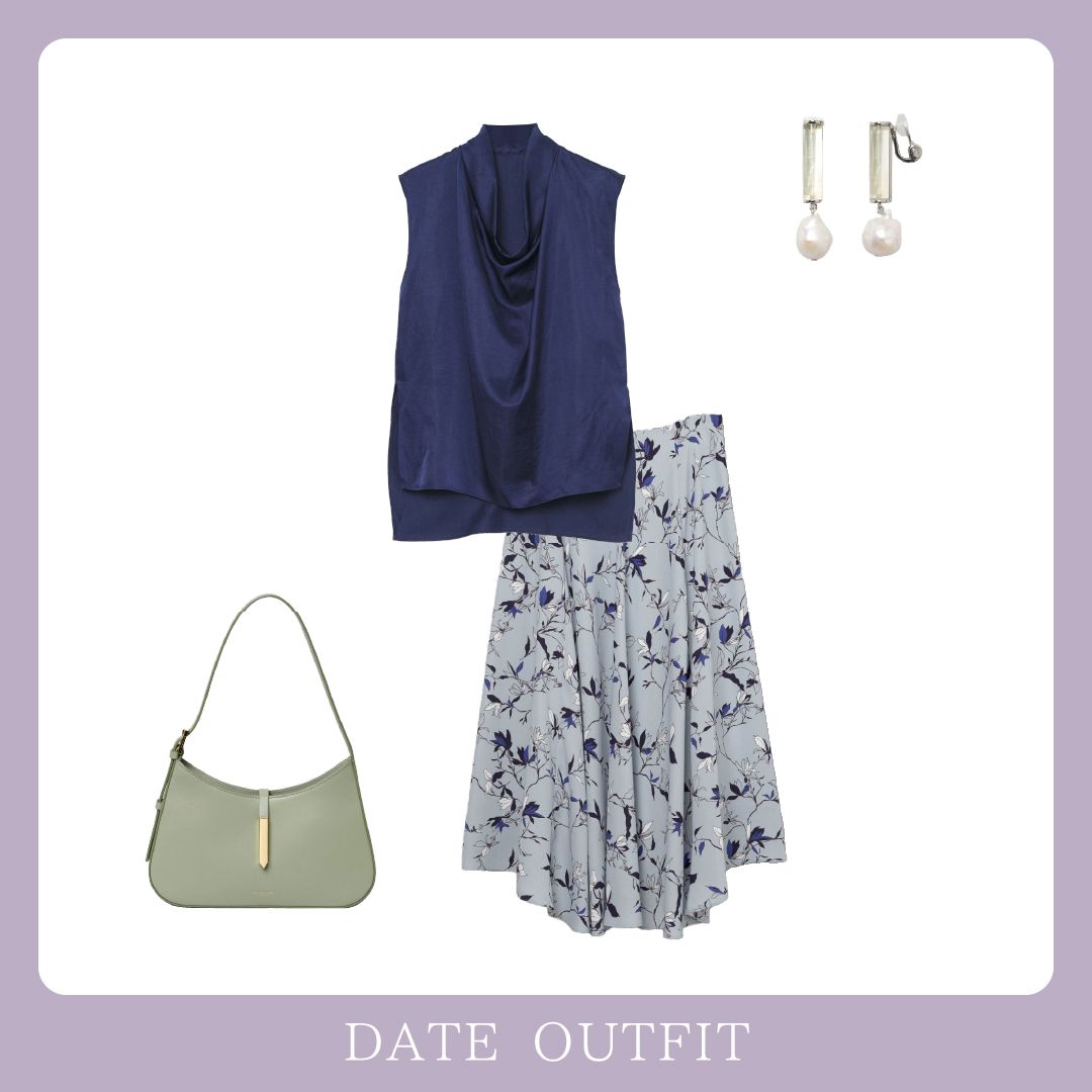 トップスが暗めの色なら、ボトムスやバッグに明るい色を選んで、軽やかさをプラスするのがポイント。今回は、落ち感の美しいブルーのフレアスカートに、グリーンのバッグを合わせて、爽やかで洗練された印象に仕上げました。