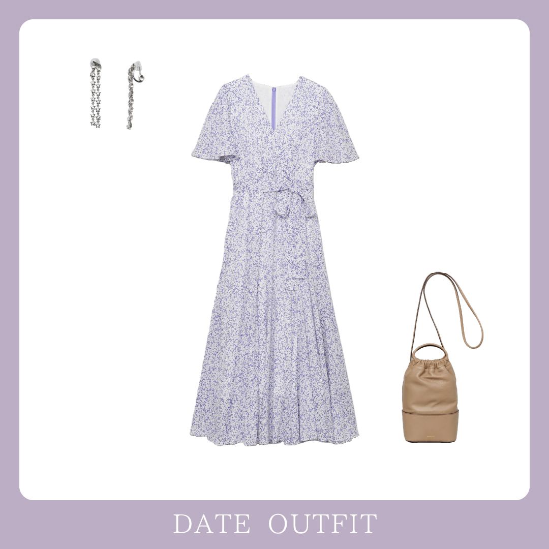 ワンピースが軽やかな質感なので、キラッと輝くイヤリングなど、アクセサリーで華やかさをプラスするのがおすすめ。ワンピースに柄が入っているぶん、バッグはシンプルなものを選んで、落ち着きと抜け感を演出しましょう。