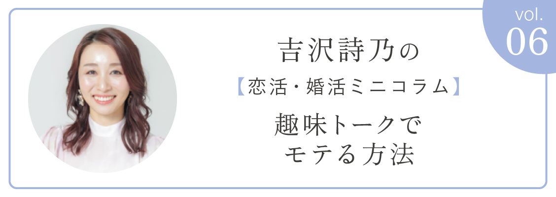 日本最大級の恋愛婚活スクール『総研アカデミー』を運営する吉沢詩乃さん。ここでは、幅広い年代の女性の婚約・入籍をサポートする恋活・婚活テクニックの一部をご紹介いただきます。第6回目のテーマは、「趣味トークでモテる方法」です。