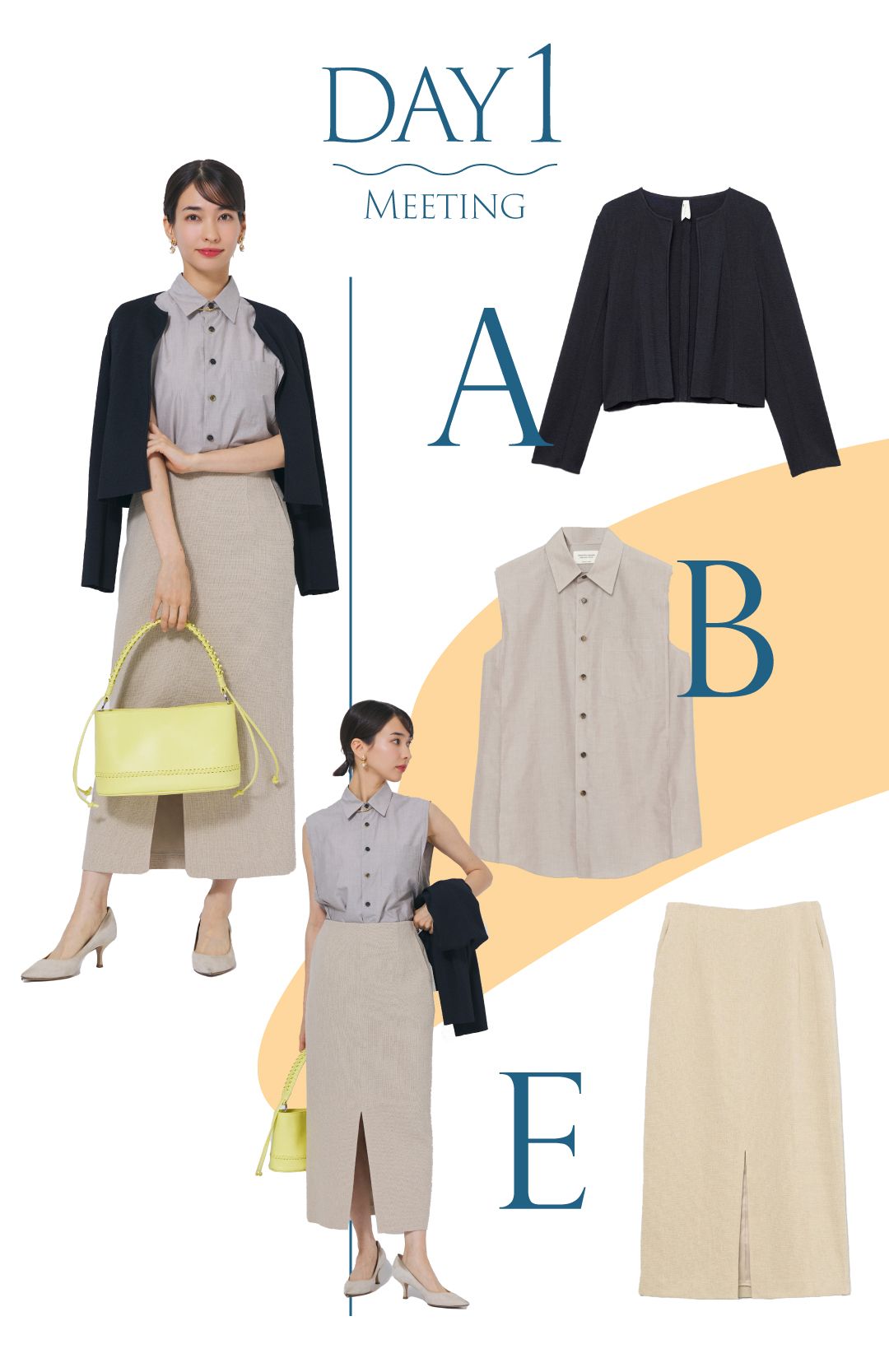社内会議の日は、ほどよくきちんと感のある服装で臨みたいもの。ノースリーブシャツ×タイトスカートの品よく涼しげなコーディネートに、ネイビーのカーディガンを肩掛けして知的な印象をプラス。差し色には視線を惹きつける明るめイエローのバッグを合わせ、持つだけで気分がぱっと華やぐスタイルに。