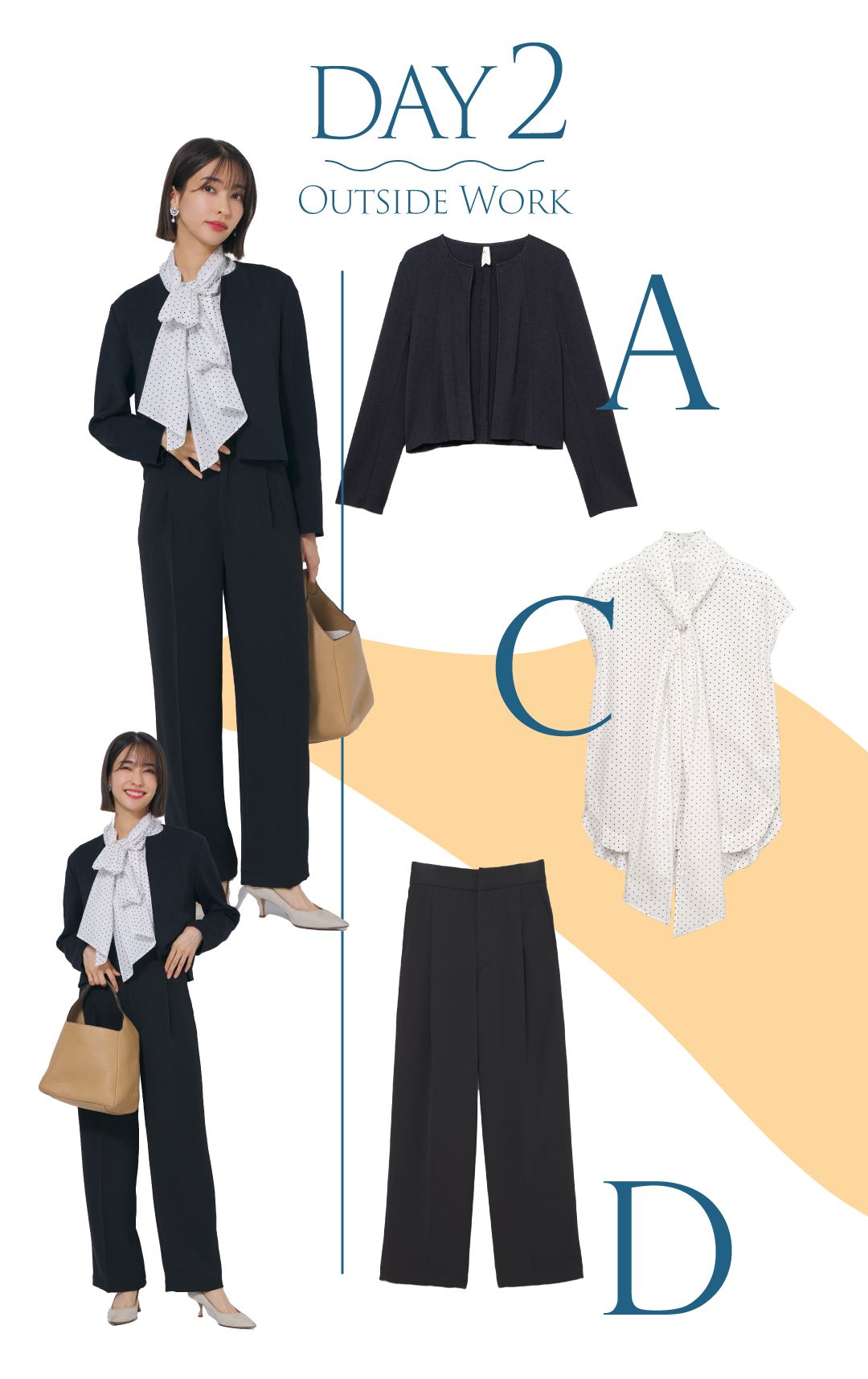 外回りの日は、清潔感と動きやすさのバランスがカギ。ドット柄のボウタイブラウス×ストレートワイドパンツの上品なモノトーンコーデに、ジャケット感覚で羽織れるカーディガンをオン。動きやすくシワになりにくいパンツと羽織りのコンビなら、長時間の外回りも快適に過ごせます。バッグは、タブレットや飲み物をスマートに持ち運べる大きめなものを選んで。