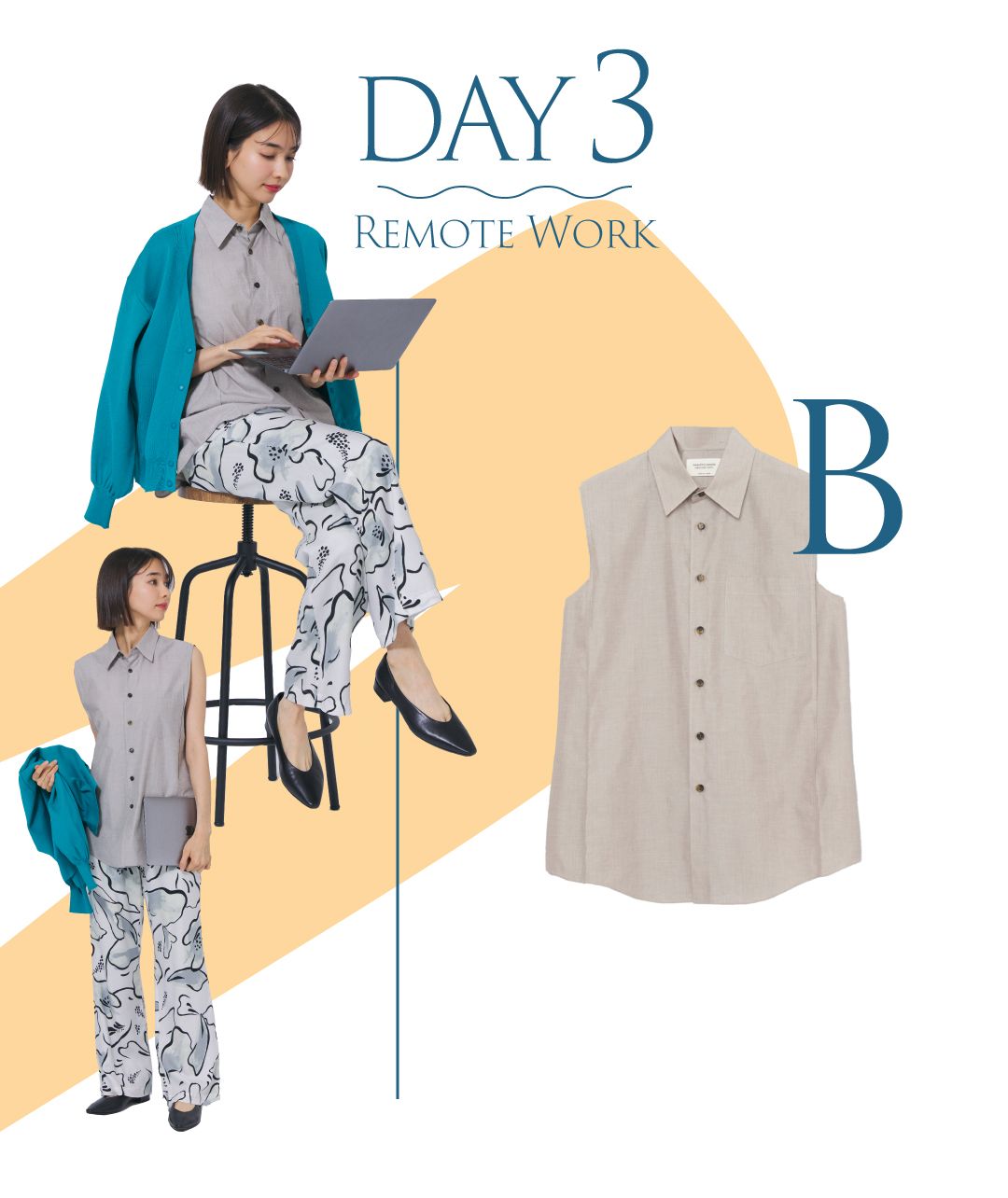 在宅勤務の日は、快適さを優先しつつ、急なオンライン会議にも対応できるきれいめな装いを意識して。グレージュのノースリーブシャツに、ゆったりシルエットのイージーパンツを合わせれば、ほどよく力の抜けた大人のカジュアルコーデが完成します。気分転換に近所のカフェで休憩を取るときは、鮮やかなブルーのカーディガンを持参して冷房対策を。羽織るだけでコーデに華やかさを足せるのも嬉しいポイント。