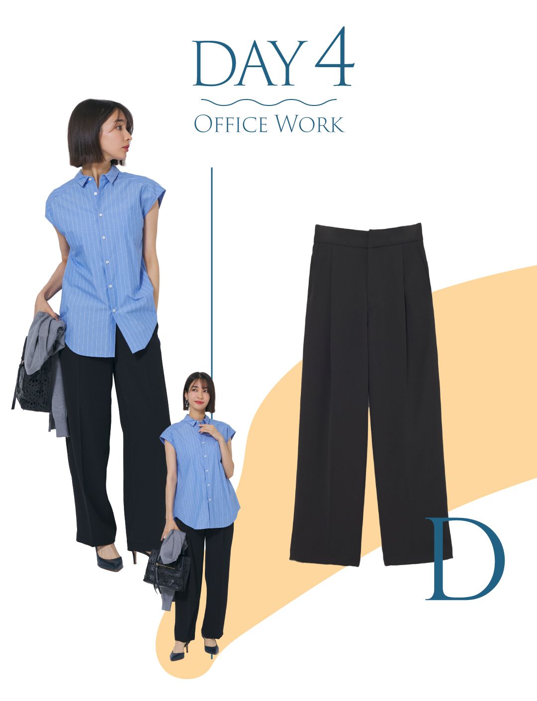オフィスでデスクワークの日は、長時間座っていても快適で、きちんと感もキープできるコーディネートがおすすめ。ウエストゴム仕様の黒パンツに爽やかなブルーのストライプシャツを合わせれば、楽ちんなのに清潔感も上品さも両立。冷房対策には、落ち着きのあるグレーのカーディガンをセレクト。シンプルながらも配色でメリハリを効かせた内勤コーデです。
