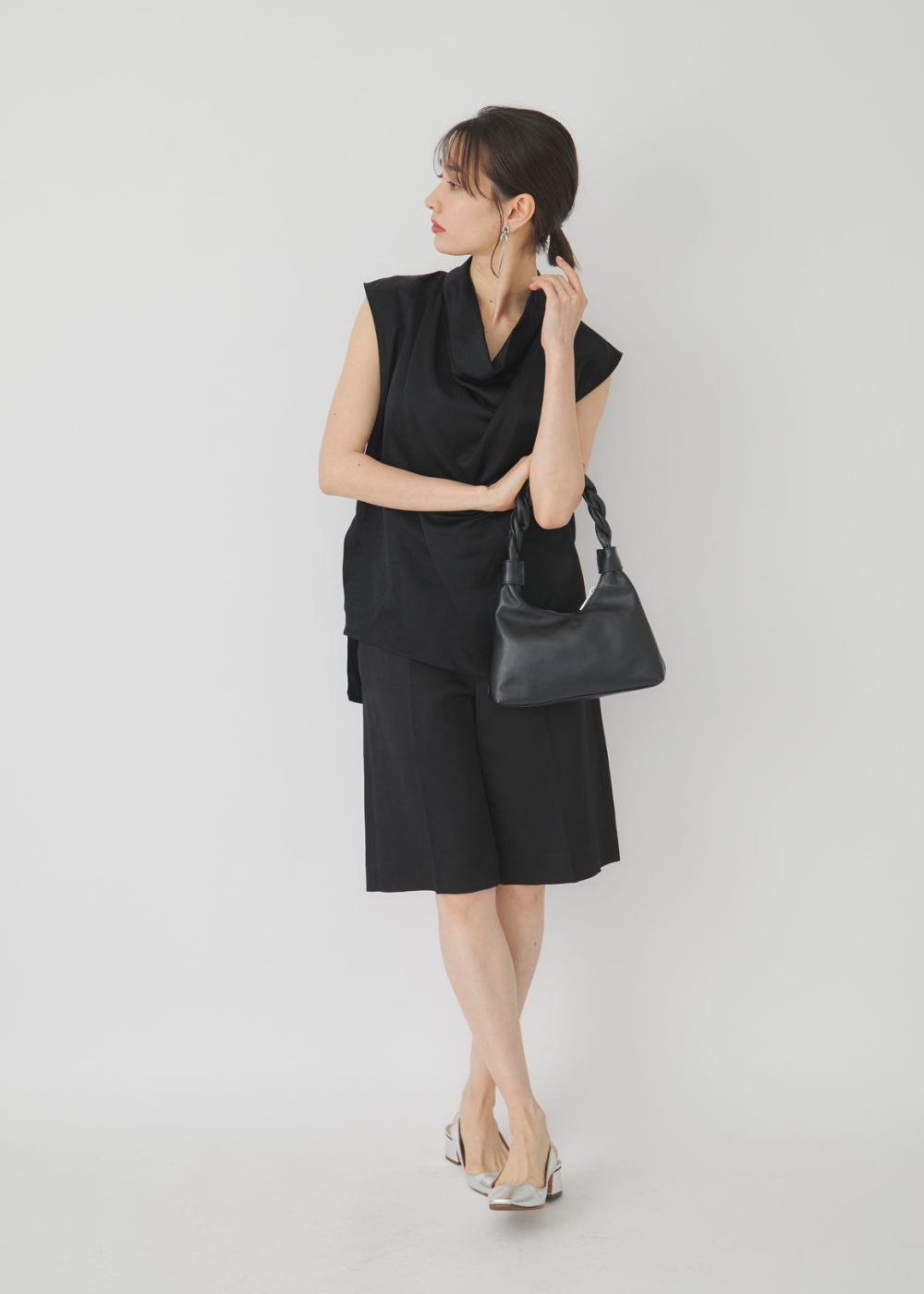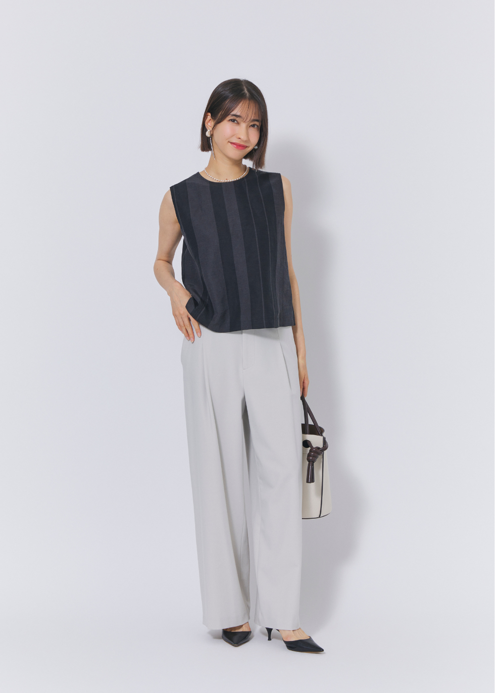 ブラックのノースリーブトップスに白のワイドパンツを合わせた、涼しげな夏のモノトーンコーデ。ブラウスはリネン混で、さらりとした肌触りも◎。夏らしい軽やかな印象のスタイリングには、パールのネックレスとイヤリングを添えることで、程よい気品と華やかさをプラスしました。