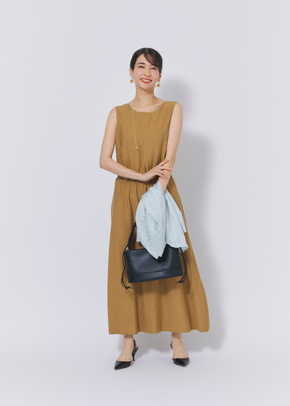 楽ちんで涼しいノースリーブワンピースは、オフィスシーンでも大活躍。ヴィンス(VINCE)のワンピースは、リラクシーなシルエットながら、自然な艶感のとろみ素材がどこか上品な印象を演出してくれます。冷房対策に透け感のあるアイスブルーのシャツを羽織れば、清涼感のあるこなれた着こなしに。