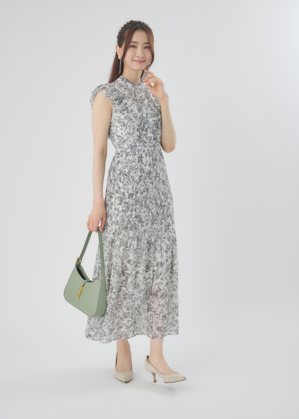 繊細なフラワープリントとさりげない透け感が、上品な甘さを演出するフレイ アイディー(FRAY I.D)のワンピース。動きに合わせて揺れる柔らかなシフォン素材が、涼しげな印象を与えてくれます。淡いグリーンのバッグを差し色にすれば、軽やかで洗練された大人のフェミニンコーデに。