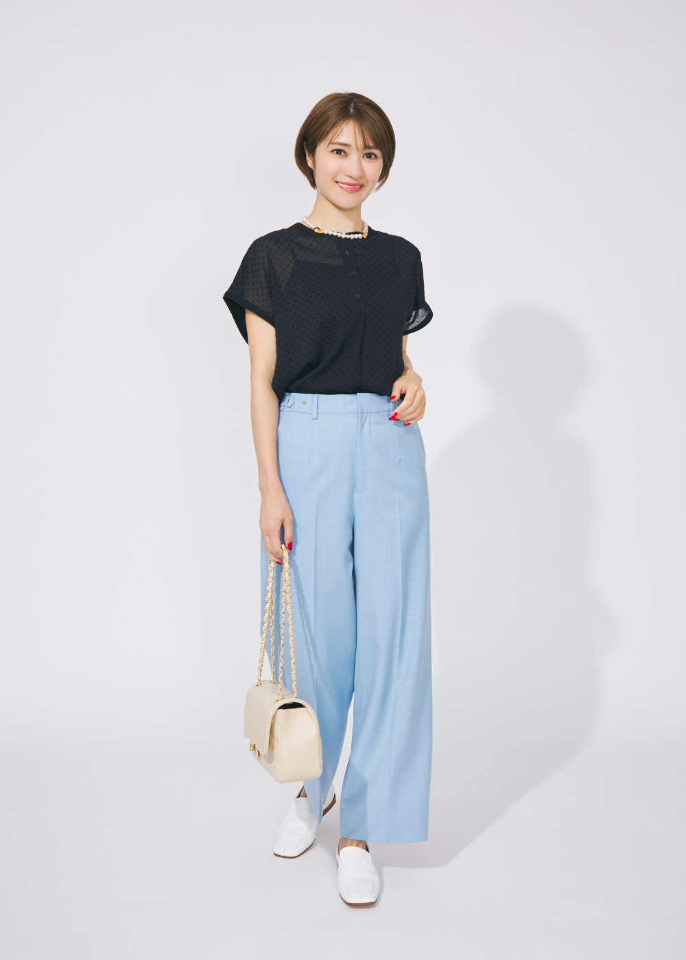 シアーな半袖ブラウスに、爽やかなブルーのパンツを合わせた清涼感たっぷりのコーディネート。夏に増えがちなトップス×パンツのシンプルなワンツーコーデには、大ぶりネックレスやチェーンバッグなど、アクセントになる小物を効かせて華やぎをプラスするのを忘れずに。