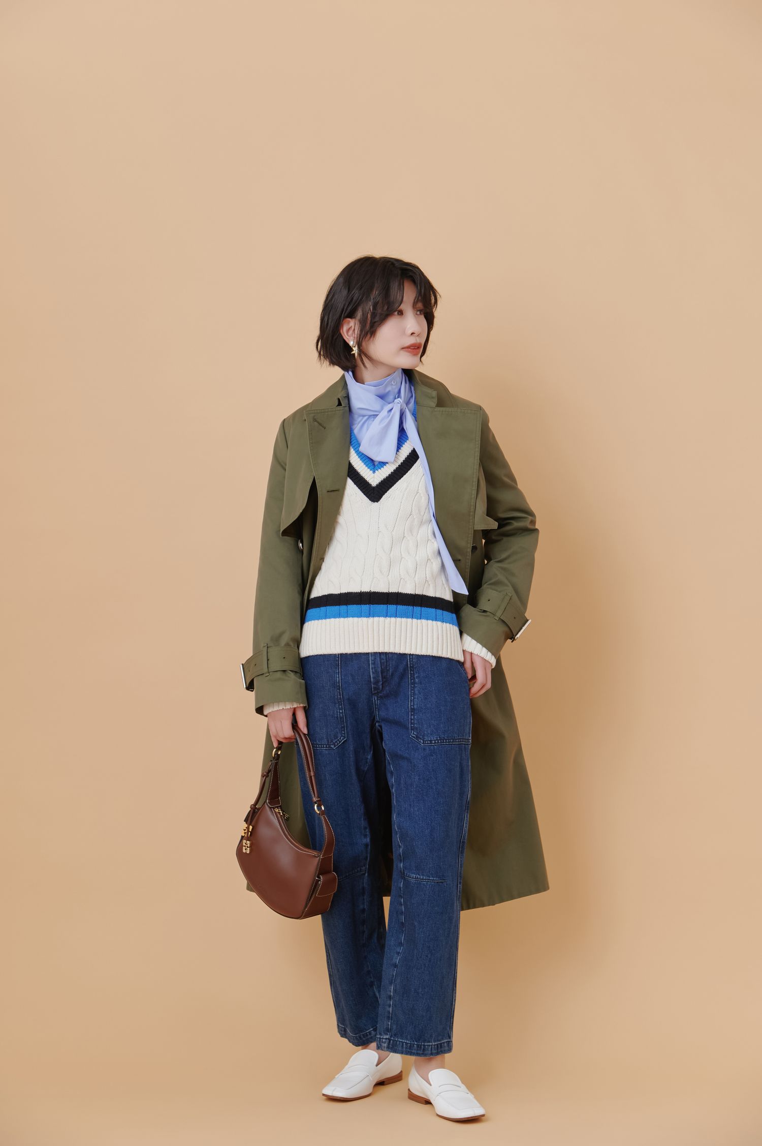 2026年春夏のトレンドカラー・アイスブルーのボウタイシャツに、ケーブル編みのVネックニットを重ねて奥行きのあるレイヤードに。仕上げにカーキのトレンチコートを羽織れば、インディゴデニムのきれいめな魅力がぐっと引き立ちます。