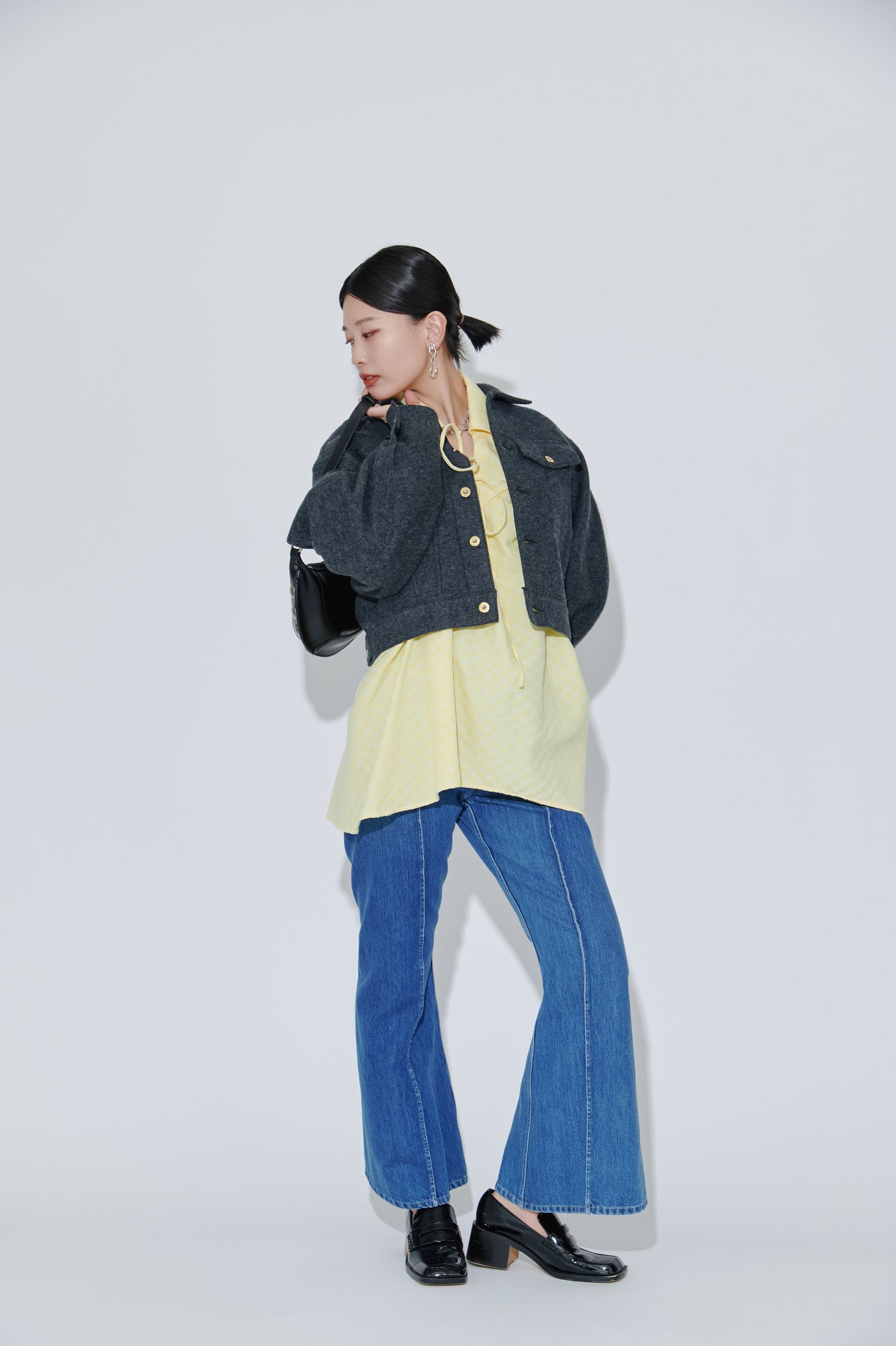 どんな色とも調和する万能さが魅力のブルーデニム。パステルイエローのロングシャツにチャコールグレーのショートブルゾンを重ねれば、都会的なモードファッションに。丈のコントラストと色の対比も効いて、スタイルアップ効果まで期待できます。
